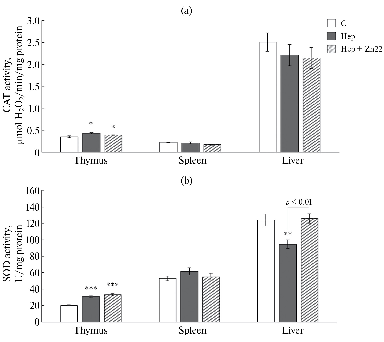 Рис. 7. Влияние опухолевого роста и приема сульфата цинка в течение 21 суток на специфическую активность антиокислительных ферментов в органах. По оси ординат: (а) – активность каталазы (CAT, catalase), µmol (мкмоль) H2O2, поглощенной за 1 мин на 1 мг общего белка (n = 10); (b) – активность супероксиддисмутазы (SOD, superoxide dismutase), у. е. на 1 мг общего белка (n = 10). По оси абсцисс: группы животных, С (Control) – контрольные животные, Hep (Hepatoma) – мыши с гепатомой 22а, Hep+Zn22 – мыши с гепатомой 22а, получавшие сульфат цинка (22 мкг/мл с питьевой водой). Звездочками обозначены достоверные различия каждой из опытных групп по отношению к группе контрольных животных (C).