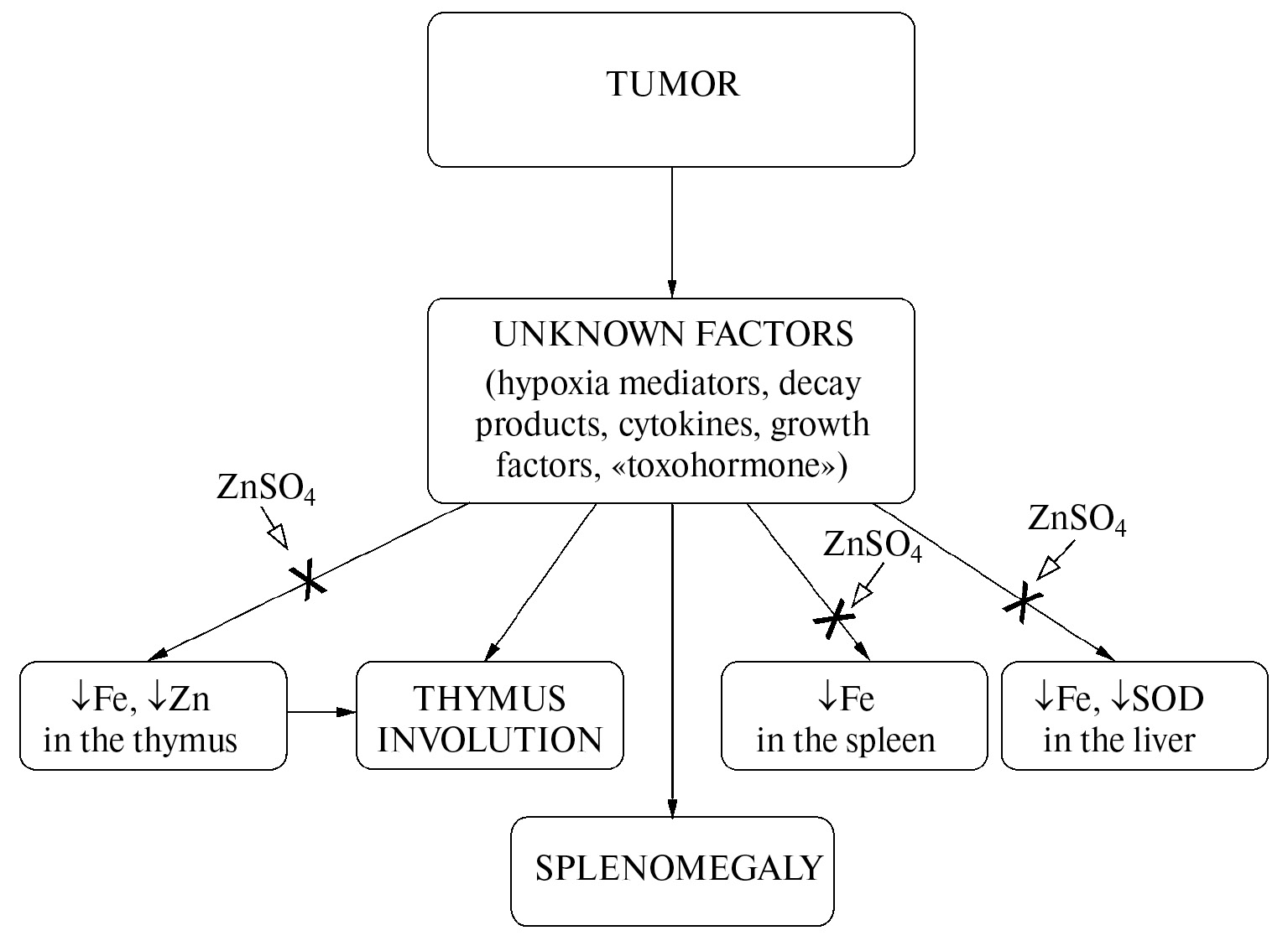 Следует признать, что атрофия тимуса при опухолевом росте является многофакторным процессом, в котором могут быть задействованы различные механизмы с участием гормонов, цитокинов, ростовых факторов, метаболитов, продуктов опухолевого распада и др., их сочетание может варьировать в зависимости от вида опухоли [11]. Полученные нами данные впервые позволяют дополнить этот список дефицитом железа и цинка как важным элементом в развитии инволюции тимуса при опухолевом росте (рис. 8).