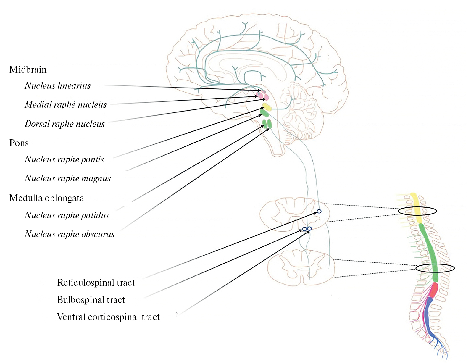 Рис. 2. Нисходящие серотонинергические проекции, иннервирующие спинальные нейронные сети.