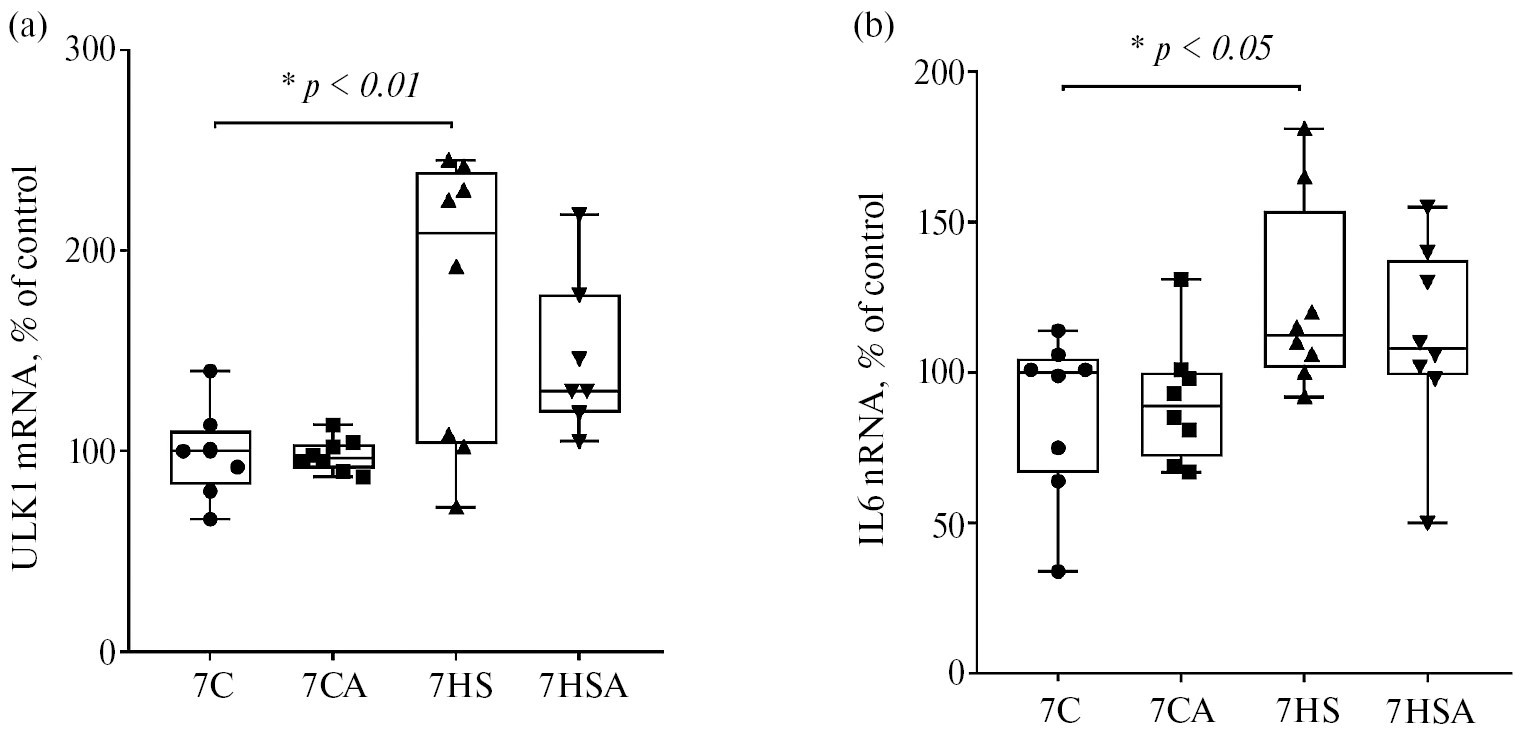 Рис. 5. Экспрессия мРНК ULK1 (а) и IL6 (b) в m. soleus при введении 2-APB на фоне 7-суточного вывешивания. 7С – виварный контроль с введением плацебо, 7СA – виварный контроль с введением 2-APB, 7HS – 7-суточное вывешивание с введением плацебо, 7HSA – 7-суточное вывешивание с введением 2-APB. * – значимые отличия между группами.