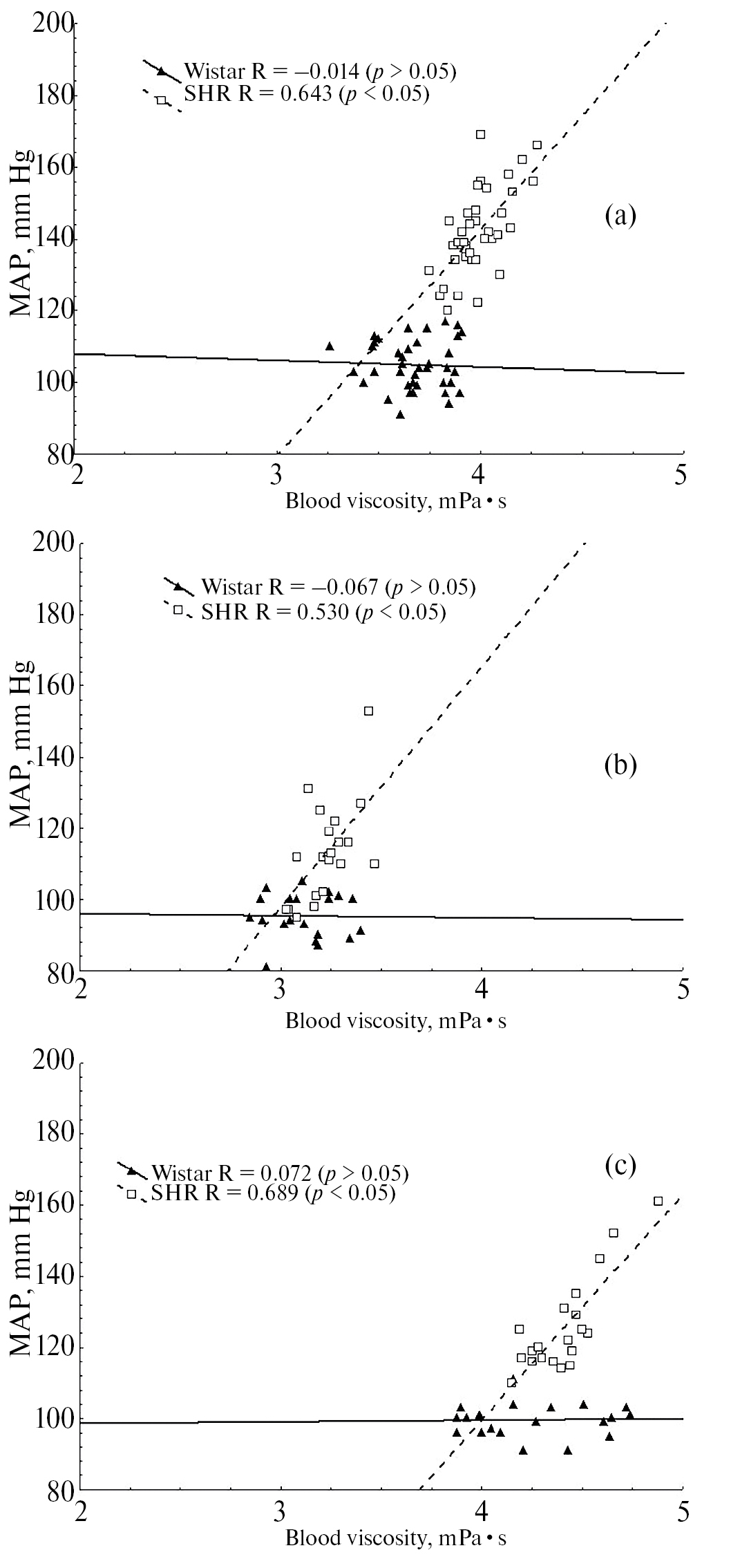 Рис. 1. Корреляционная зависимость вязкости крови (450 с-1) и СрАД у крыс Вистар и крыс SHR. (a) – исходные значения, (b) – после гемодилюции, (c) – после гемоконцентрации.