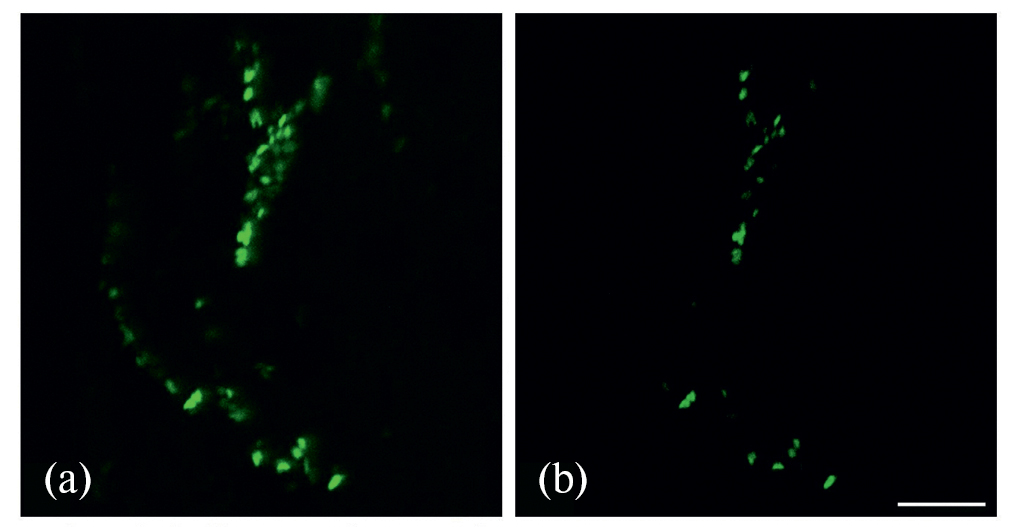 Рис. 1. Флуоресценция нервно-мышечных синапсов соматических мышечных клеток дождевого червя, загруженных липофильным красителем FM2–10. (a) – 0 мин, (b) – через 5 мин «разгрузки» красителя при 40 мМ K+ в окружающем растворе. Масштабная линейка: 20 мкм.