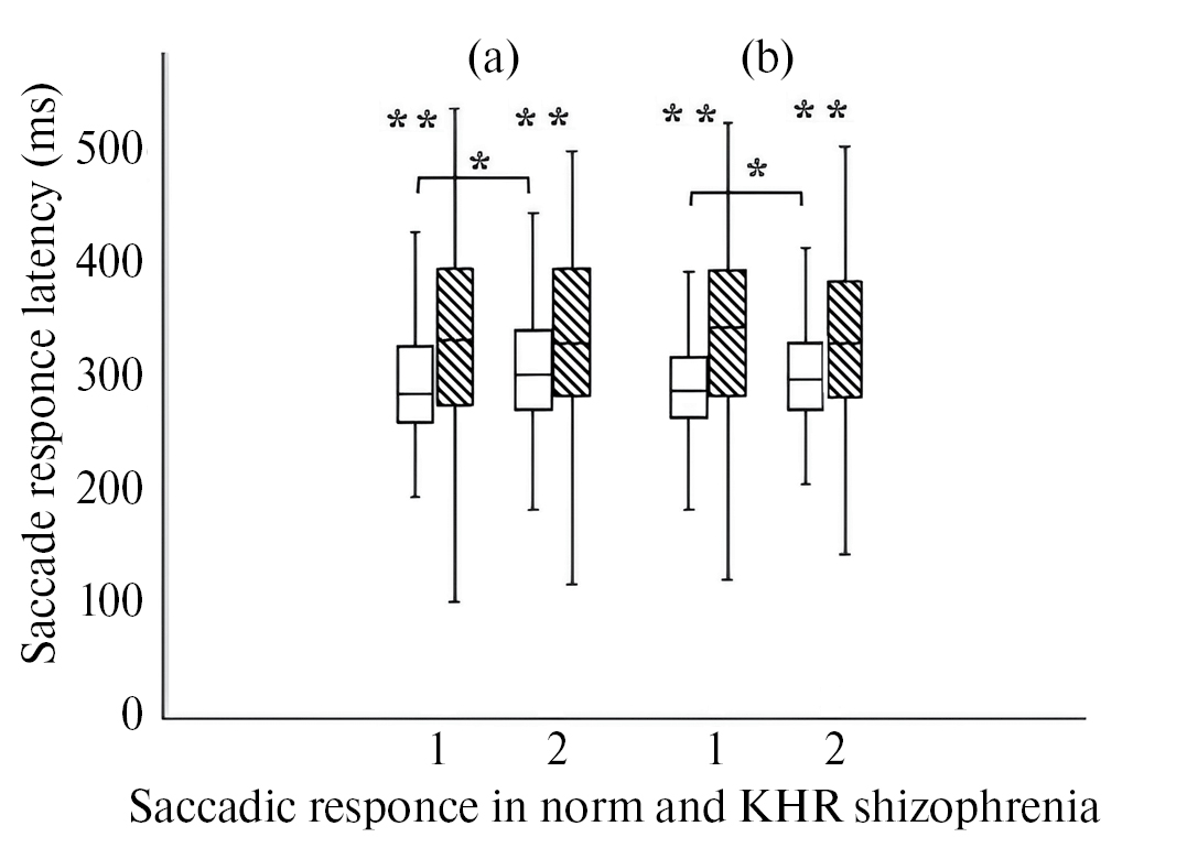Условные обозначения: светлые прямоугольники – здоровые испытуемые, заштрихованные прямоугольники – больные с КВР. На оси абсцисс: 1 – саккадические ответы влево, 2 – саккадические ответы вправо. Звездочки означают достоверность различий средних значений: * с вероятностью p ≤ 0.01, ** с вероятностью p ≤ 0.001.