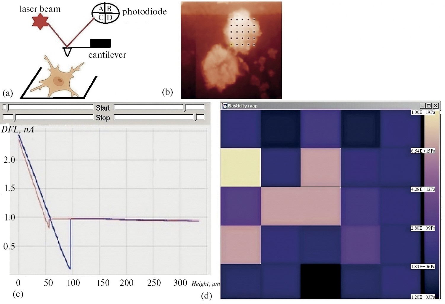 Рис. 1. Процедура атомно-силовой спектроскопии клеточной поверхности нейрона на 1-е сутки дифференцировки в культуре: (a) – принципиальная схема сканирования образца: клетка на подложке; кантилевер, который перемещается по клеточной поверхности; луч лазера настроен на гибкую консоль кантилевера, которая отклоняется при перемещении по поверхности и передает информацию на 4-секционный фотодиод, (b) – изображение нейрона, полученное при сканировании в программном обеспечении Nova с наложением нагрузки (1 нН) в 25 точках поверхности, (c) – кривые подвода (синяя) и отвода (красная) в каждой точке наложения нагрузки, по которым программное обеспечение строит карты локальной упругости, (d) – карта локальной упругости поверхности нейрона (темные участки карты указывают на высокие значения модуля Юнга, а значит и более высокую жесткость поверхности).