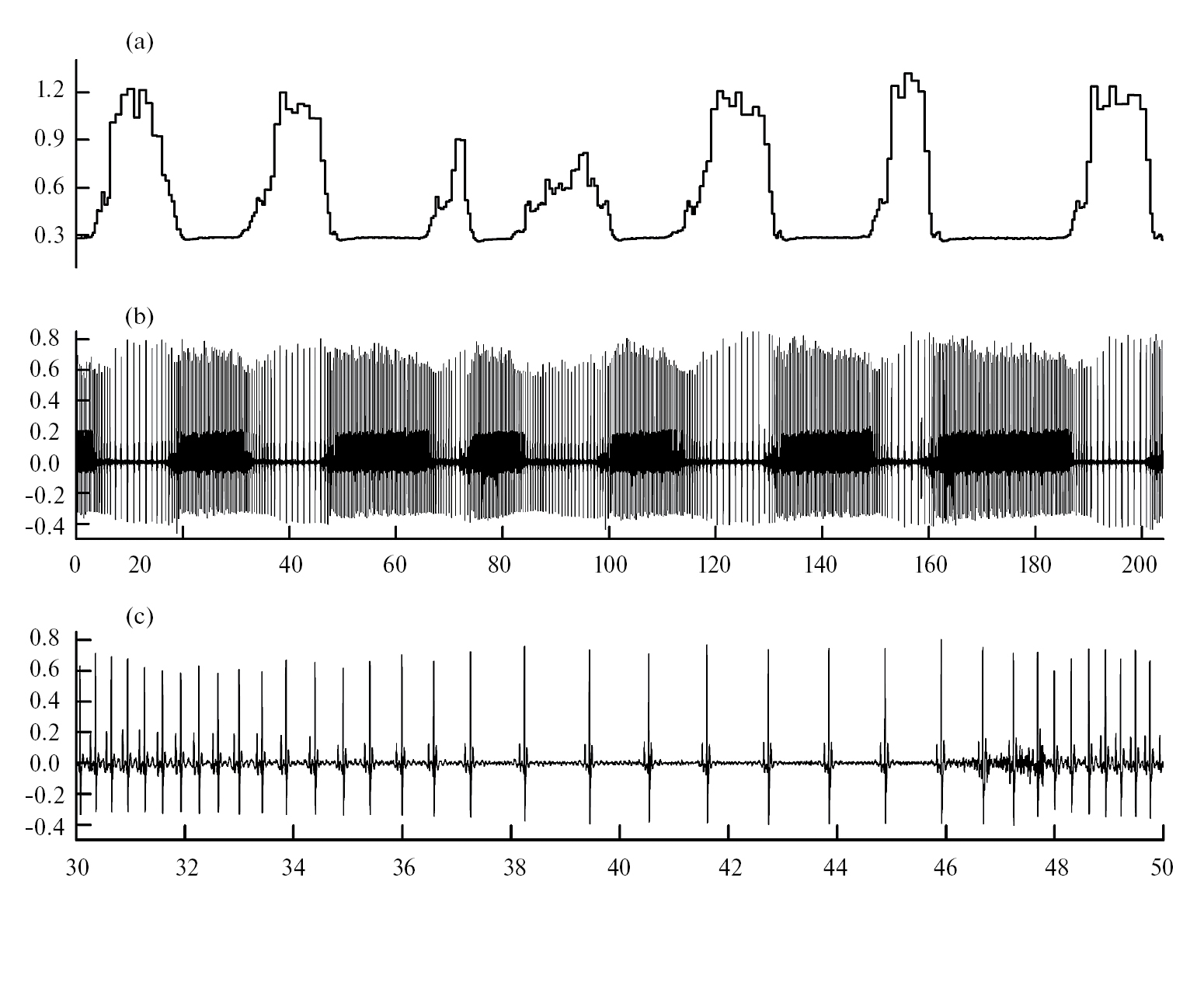 Рис. 1. Нарушения сердечного ритма у 3-дневного крысенка через 14 мин после инъекции NiCl2 в дозе 109 мг/кг. Представлены периодограмма сердечного ритма (а), ЭКГ (b) и фрагмент записи ЭКГ с 30 по 50 с (c). По оси абсцисс – время (с), по оси ординат – амплитуда ЭКГ (мВ) и периодограммы ритма (с).