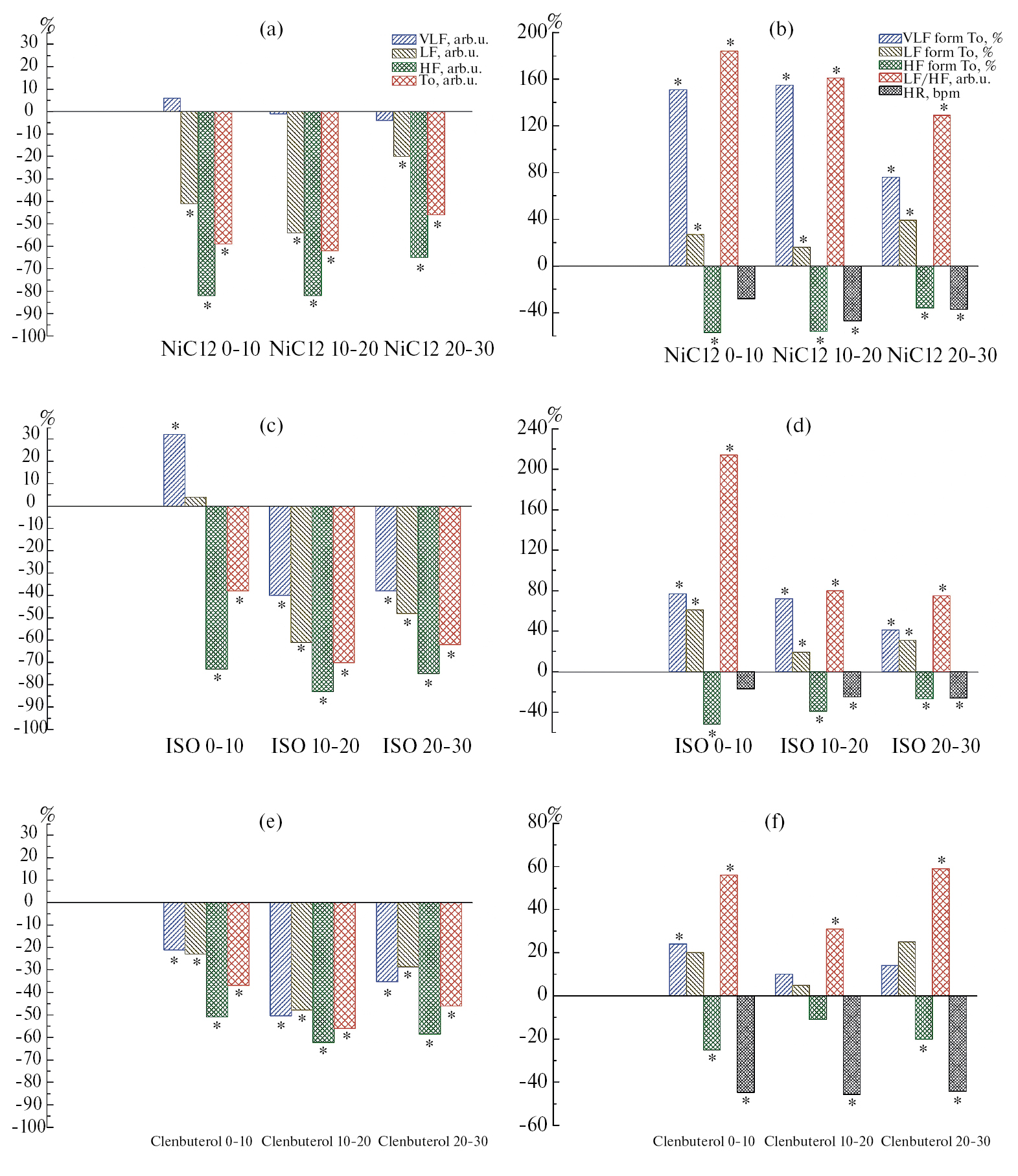 Рис. 2. Сдвиг показателей ВСР у 3-дневных крысят после инъекции NiCl2 (a, b), изопротеренола (c, d) и кленбутерола (e, f), представленный в % от исходного (фонового) уровня, принятого за 100%. Значения показателей VLF, LF, HF, To (a, c, e) даны в нормированном виде (максимумы мощности индивидуальных спектров приняты за 1). Относительная мощность диапазонов VLF, LF, HF (b, d, f) представлена в % от общей (То) мощности спектра. Коэффициент LF/HF рассчитан, исходя из усредненных индивидуальных нормированных показателей LF и HF. ЧСС (HR) представлена в уд/мин.