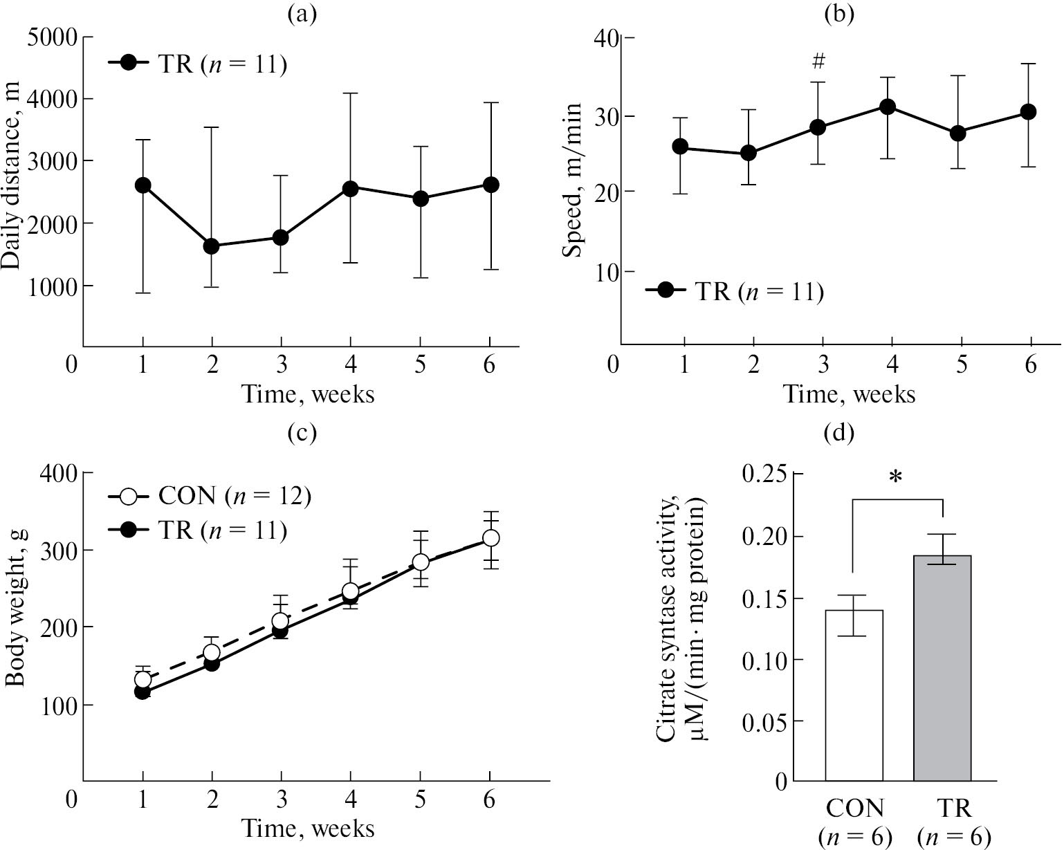 Рис. 1. Динамика показателей беговой активности (a – суточный пробег, b – скорость бега) и массы тела (c) крыс в течение эксперимента, а также активность цитратсинтазы в трехглавой мышце плеча (d). CON – контрольная группа, TR – тренированная группа. Данные представлены в виде медианы и межквартильного размаха, в скобках указано количество животных в выборке. #p < 0.05 по сравнению со значением на первой неделе тренировочного цикла (критерий Фридмана); *p < 0.05 (критерий Манна – Уитни).