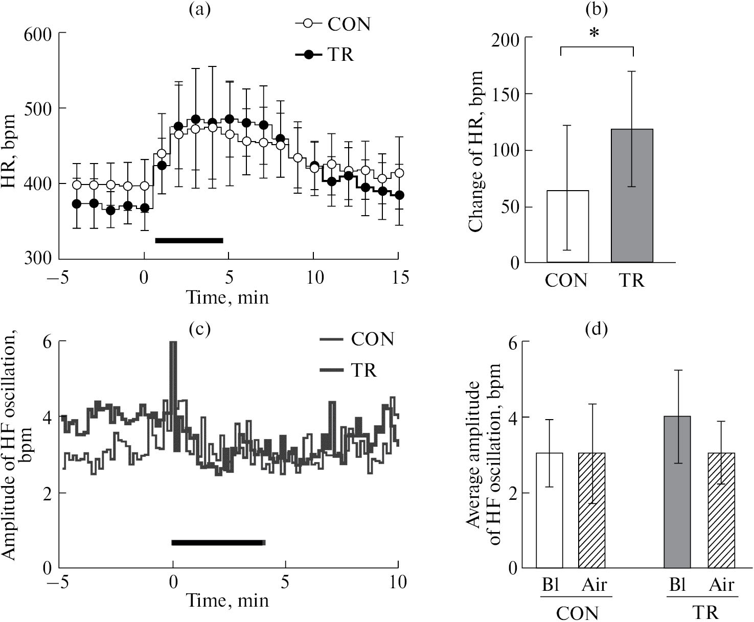 Рис. 3. Влияние air-jet стресса на ЧСС и амплитуду высокочастотных колебаний ЧСС у контрольных (CON, n = 10) и тренированных (TR, n = 10) крыс. На рисунках приведены динамика ЧСС (a), изменение ЧСС при стрессе (разность значений для двух 4-минутных интервалов – во время подачи воздуха и непосредственно перед воздействием) (b), динамика амплитуды высокочастотных колебаний ЧСС (каждая линия – результат усреднения данных для всех крыс в экспериментальной группе) (c) и значения амплитуды высокочастотных колебаний ЧСС, усредненные для двух 4-минутных интервалов – до воздействия (Bl) и во время стресса (Air) (d). Период air-jet стресса (4 мин) отмечен на рисунках (a) и (c) горизонтальной линией. На рисунках a, b и d данные представлены в виде среднего и стандартного отклонения. *p < 0.05 (непарный критерий Стьюдента); #p < 0.05 (двухфакторный дисперсионный анализ для повторных измерений с апостериорным тестом Сидака).