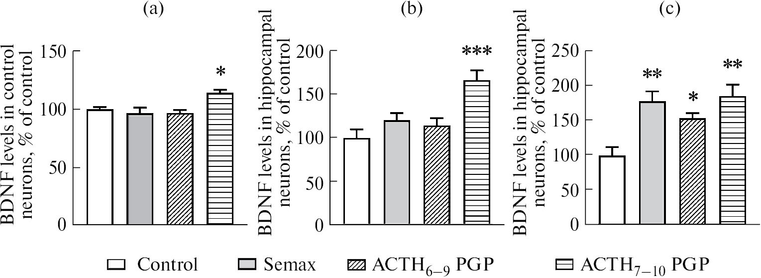 Исследование влияния аналогов фрагментов АКТГ на содержание нейротрофических факторов в культуре нейронов показало, что только АКТГ7-10PGP в использованной концентрации (0.1 нМ) способен стимулировать уровни BDNF в первичных культурах нейронов гиппокампа и коры больших полушарий мозга крысы. Введение семакса или АКТГ6-9PGP в использованной концентрации не влияло на содержание этого нейротрофина в культурах. Все три исследованных пептида оказывали стимулирующее влияние на уровни VEGF в культуре нейронов гиппокампа.
