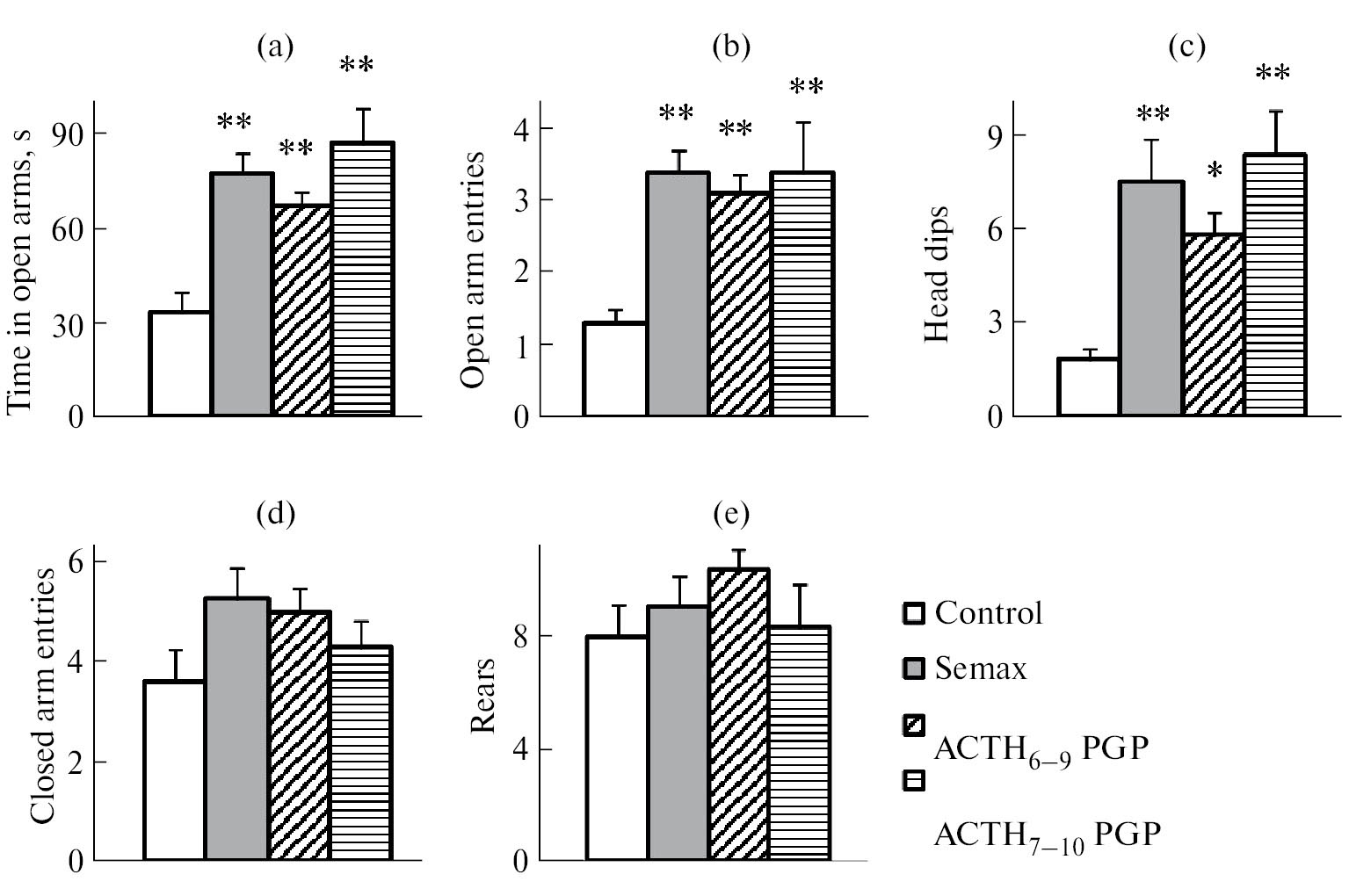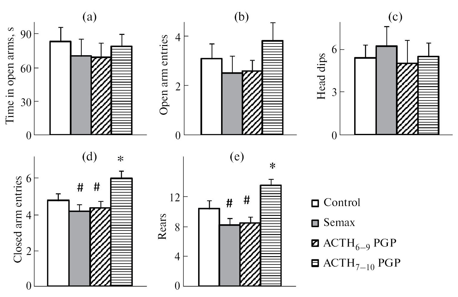 Оценка влияния исследуемых препаратов на эмоциональное состояние животных показала, что семакс и АКТГ6-9PGP не влияют на поведение крыс в условиях незначительной стрессорной нагрузки, однако в условиях, провоцирующих реакцию тревоги и страха, оказывают анксиолитическое действие. Введение АКТГ7-10PGP также приводило к снижению тревожности животных в стрессогенных условиях. Однако этот пептид, в отличие от семакса и АКТГ6-9PGP, стимулировал исследовательскую активность крыс в условиях незначительной стрессорной нагрузки.