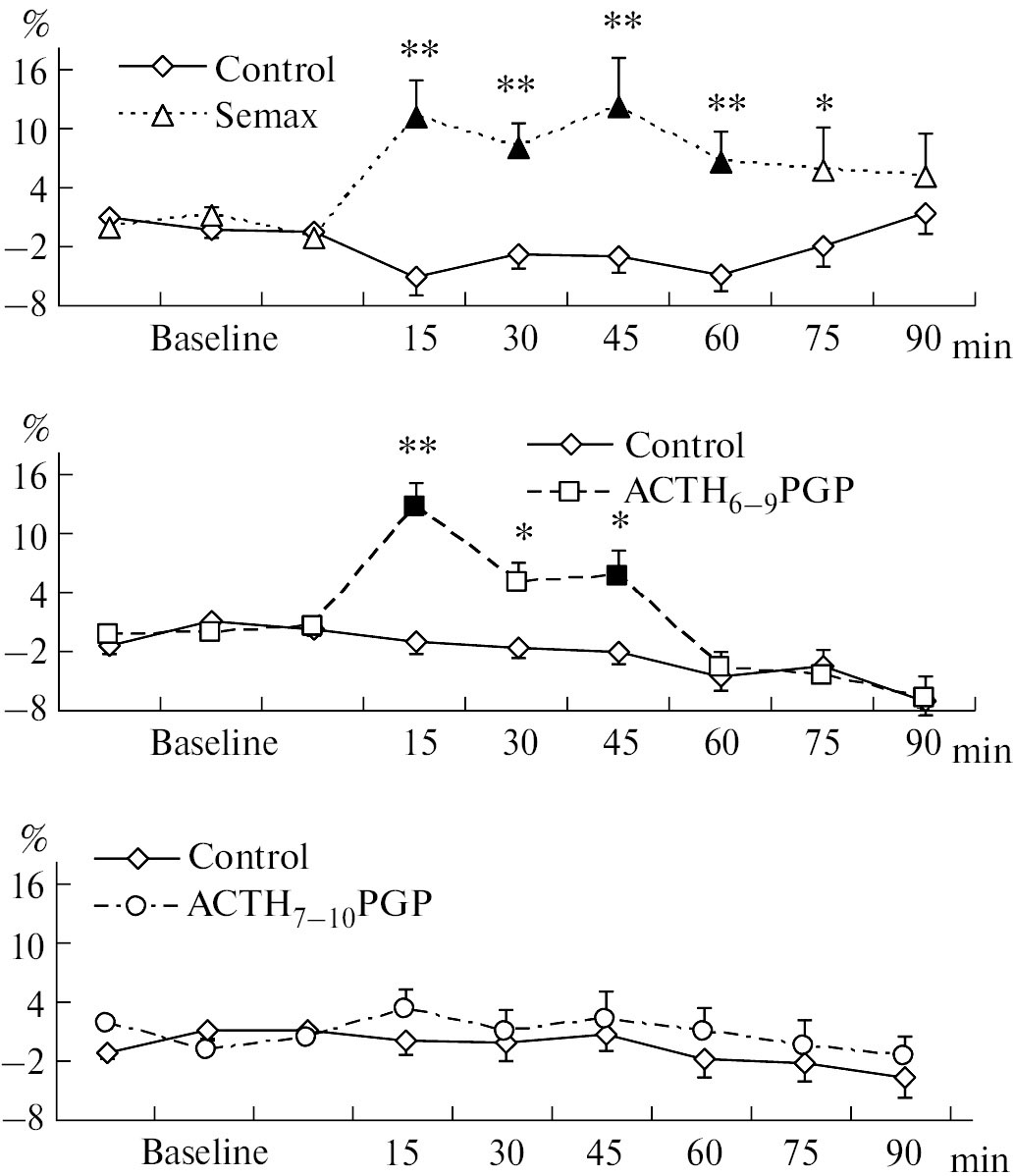 Рис. 4. Влияние семакса, АКТГ6-9PGP и АКТГ7-10PGP на болевую чувствительность крыс в тесте “сдавливание задней лапы”. Пептиды вводили внутрибрюшинно в дозе 0.5 мг/кг. По оси абсцисс – время относительно момента введения препарата (мин); по оси ординат – величина болевого порога в процентах к максимально возможному эффекту. В каждой группе было по 15 крыс. Данные представлены в виде среднего ± стандартная ошибка среднего. Статистически значимые отличия от контроля отмечены * (p < 0.05) и ** (p < 0.01). Статистически значимые отличия от фоновых значений (p < 0.05) отмечены закрашенными символами.