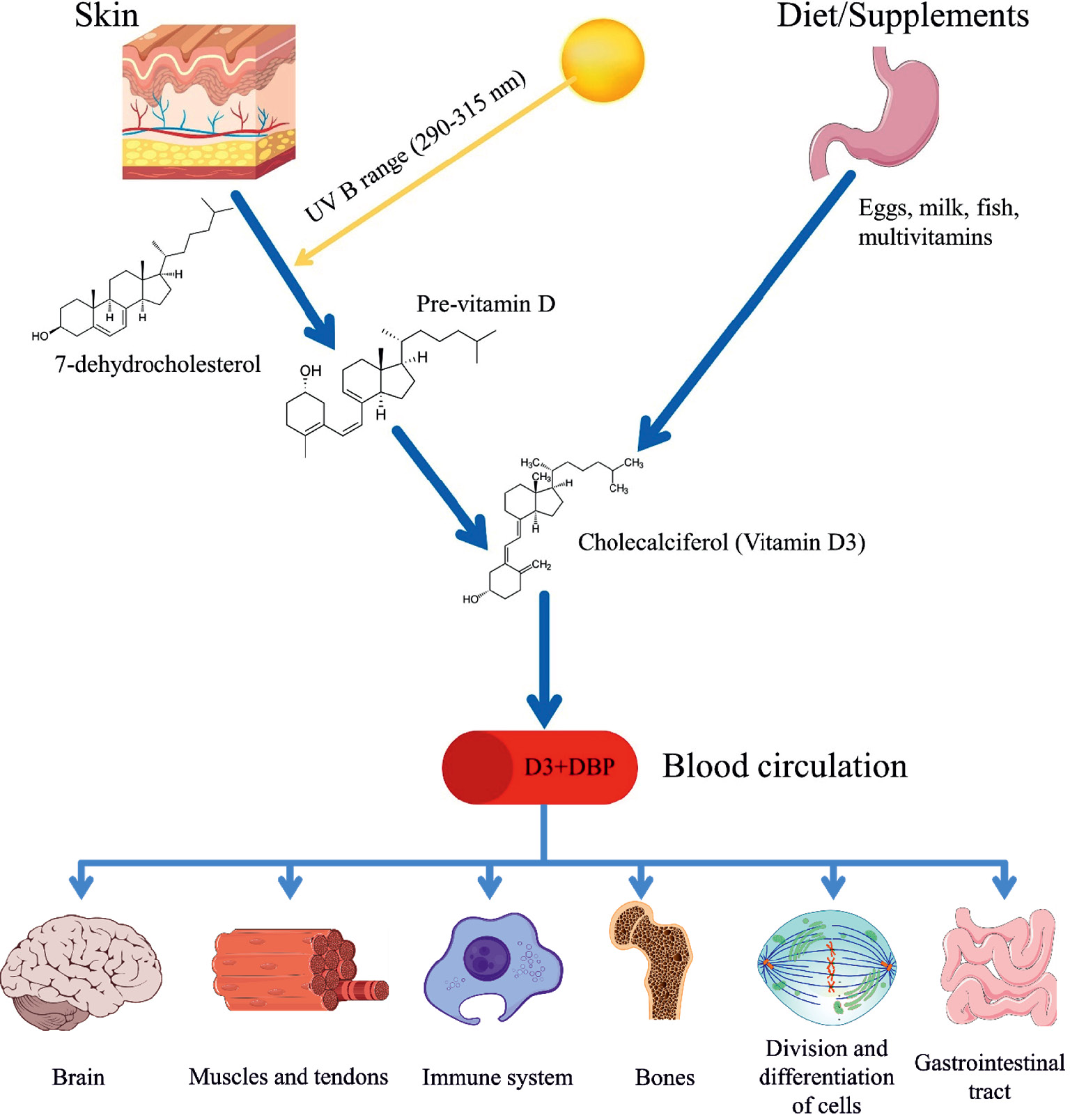 Еще один важный аспект касается концентрации в крови активных форм витамина Д и, соответственно, выбора доз препарата, назначаемых при его дефиците. Значительная часть витамина Д синтезируется в коже под действием солнечного света, степень воздействия которого трудно стандартизировать, вследствие чего оценить норму потребления витамина Д весьма сложно. При этом само определение концентрации активных форм витамина Д в крови в условиях клиники сопряжено со множеством трудностей. Важно также и то, что препараты витамина Д (Д3) могут запускать отрицательные обратные связи в организме, приводящие к компенсаторному усилению деградации его активной формы и параллельно с этим вызывающие нарушение целого ряда физиологических процессов. Немаловажную роль также играют белки, специфично связывающие различные формы витамина Д (DBP), что непосредственно влияет на концентрацию данного гормона в крови (см. рис. 2). Поэтому уровень и физиологическую активность данных белков (а также их возможную индивидуальную вариабильность) также следует учитывать при выборе доз для терапии витамином Д.