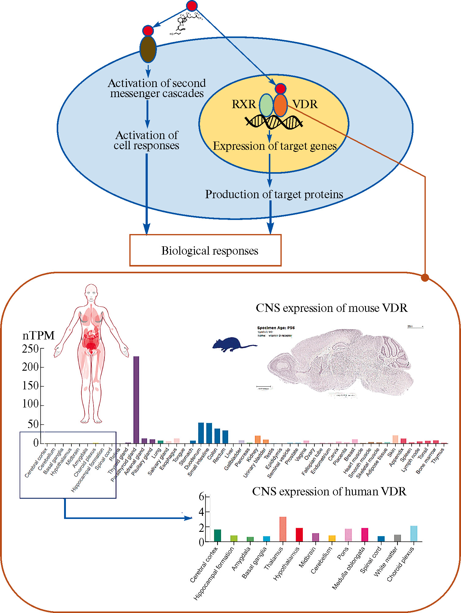 Рис. 3. Действие витамина Д на его специфические ядерные (VDR) и мембранные (mVDR) рецепторы. Внизу суммировано распределение VDR в различных тканях и в разных отделах мозга человека (по данным Атласа белков человека, www.proteinatlas.org/ENSG00000111424-VDR/, август 2024 г.) и в мозге мыши (по данным Атласа мозга Аллена, www.mouse.brain-map.org/experiment/show/100144119, август 2024 г.). RXR – ретиноидный рецептор (образует гетеродимер с VDR в ядре при связывании витамина Д)