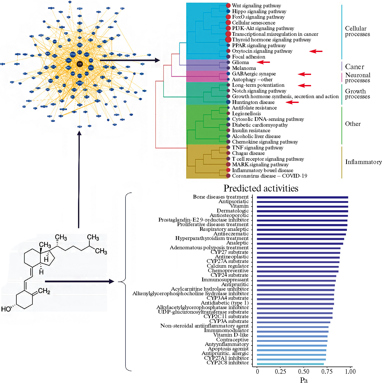 Важный вопрос касается и самой природы витамина Д. Традиционно считается, что кальцитриол является основной физиологически активной формой витамина Д в организме [149]. Тем не менее имеются сведения о биологических эффектах кальциферола, ранее считавшегося малоактивной циркулирующей формой витамина Д [17]. Таким образом, роль этого и других лигандов VDR в ЦНС остается малоизученной и требует дальнейших исследований. Для более глубокого изучения биологической активности витамина Д нами был проведен анализ кальцитриола in silico с использованием базы данных PASS Online [150], позволяющей прогнозировать функциональные свойства малых молекул на основе их химической структуры по библиотеке из более 250 000 известных свойств на август 2024 г. (см. рис. 4).