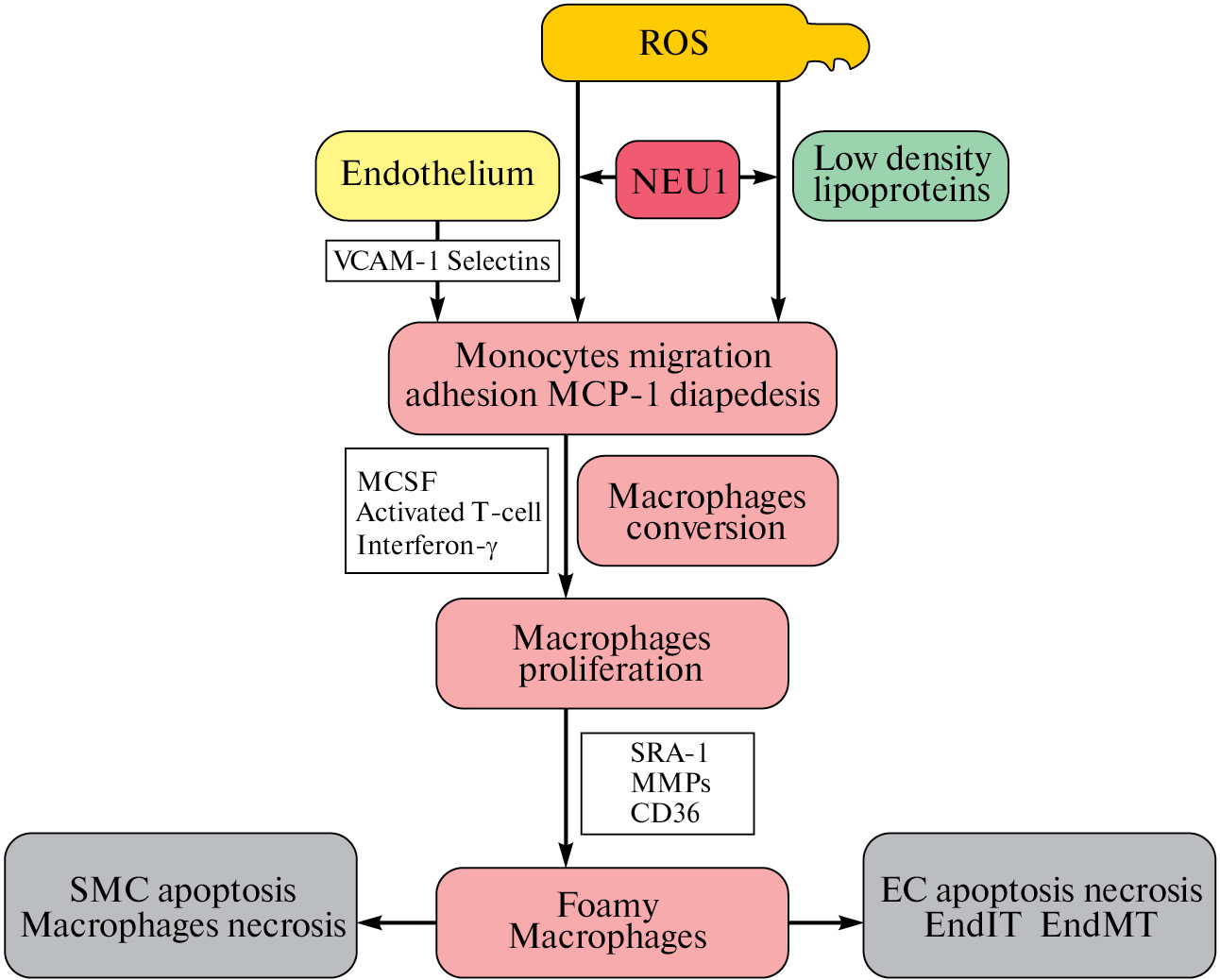 Рис. 1. Холестерин и избыток генерации АФК – ключевые факторы атерогенеза. Усилителем процесса является десиалирование ЛПНП и ЭК нейраминидазой 1 (NEU1). Прикрепление моноцитов к эндотелию облегчается экспрессией VCAM-1 и селектинами. Окисление и другие модификации ЛПНП вызывают секрецию MCP-1 (макрофагально-хемотаксический белок-1). В артериальной интиме моноциты созревают в макрофаги. Макрофаги экспрессируют рецепторы-скавенджеры, такие как SRA и CD36, которые облегчают поглощение модифицированных ЛПНП и превращение в пенистые макрофаги, которые богаты эфирами холестерина и свободными жирными кислотами. Моноциты/макрофаги размножаются в присутствии MCP-1 и макрофагального колониестимулирующего фактора (MCSF). После антигенспецифической активации Т-клетки проникают в интиму, секретируя интерферон-γ, который посылает сигналы, помогающие усилить воспалительную реакцию и поддерживать ее. Макрофаги выделяют MMPs (матриксные металлопротеиназы), которые способствуют расщеплению коллагена, позволяя клеткам мигрировать в пределах бляшки. Накопление и агрегация oxLDL и инфильтрация макрофагов вызывают преобразование липидного пула в некротическое ядро.