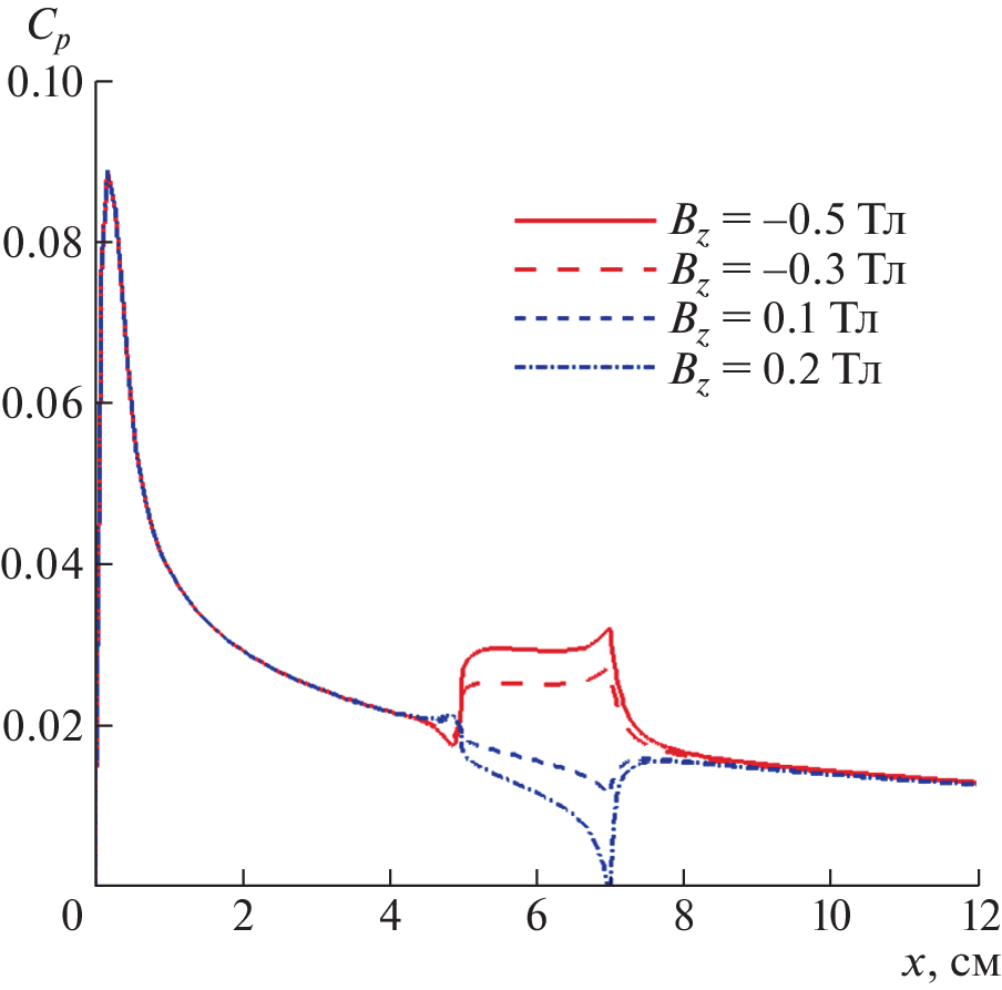 The electrodynamic structure of an anomalous glow discharge between two plane electrodes located on the surface of a sharp plate in supersonic flow of molecular nitrogen is studied numerically in a wide range of Mach numbers using a modified ambipolar model of quasi-neutral electric-discharge plasma. The ambipolar diffusion coefficient and the effective ionization rate are modified while taking into account the external magnetic field. The problem is solved in the two-dimensional x–y formulation, when the external magnetic field strength is directed in the positive or negative direction of the z axis. The parameters of anomalous glow discharge are numerically studied in the pressure range p = 0.14–5 Torr and the voltage drops on the quasineutral current column of discharge plasma V = 30–320 V. The main problem parameters which make it possible to obtain a reasonable agreement with the available experimental data are determined.