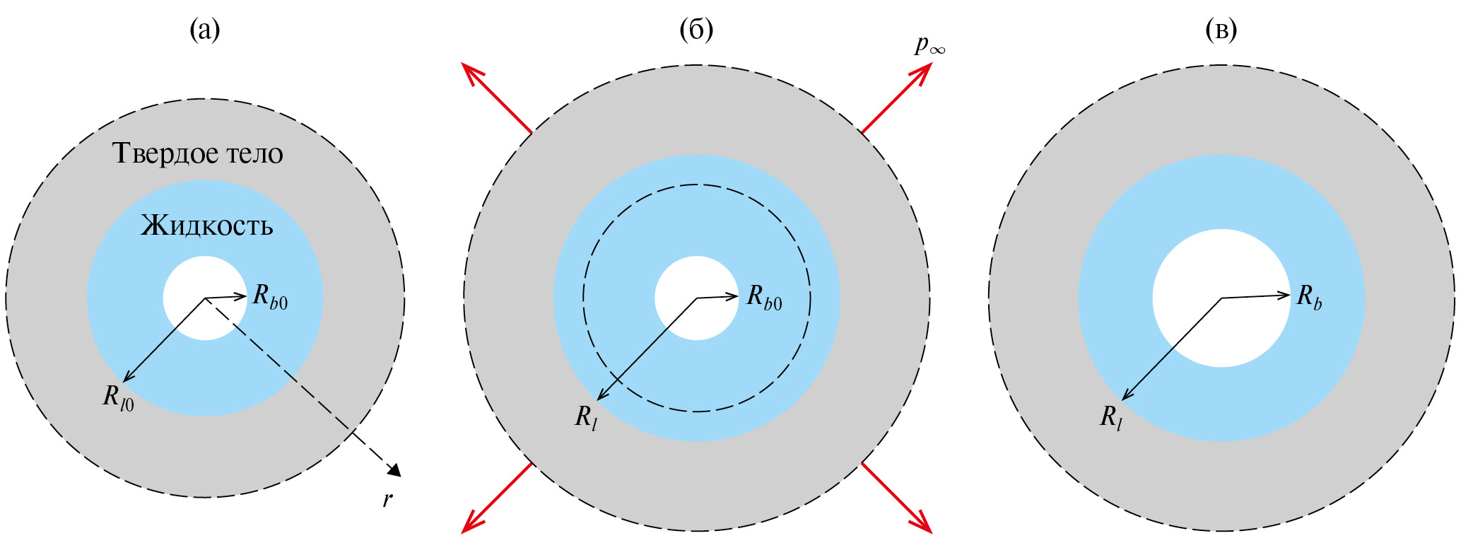 В настоящее время существует несколько моделей трехслойной геометрии ограниченных пузырьков [23–28], которые предполагают фиксированное количество газа в пузырьке. В работе [28] исследуется динамика пузырька в сферической ячейке жидкости, заключенной в бесконечное упругое твердое тело, когда в качестве управляющего динамического параметра используется давление в твердом теле вдали от пузырька. Авторы провели анализ колебаний пузырька и рассмотрели динамический отклик малых и больших пузырьков в состояниях ниже и выше порога кавитации соответственно.
