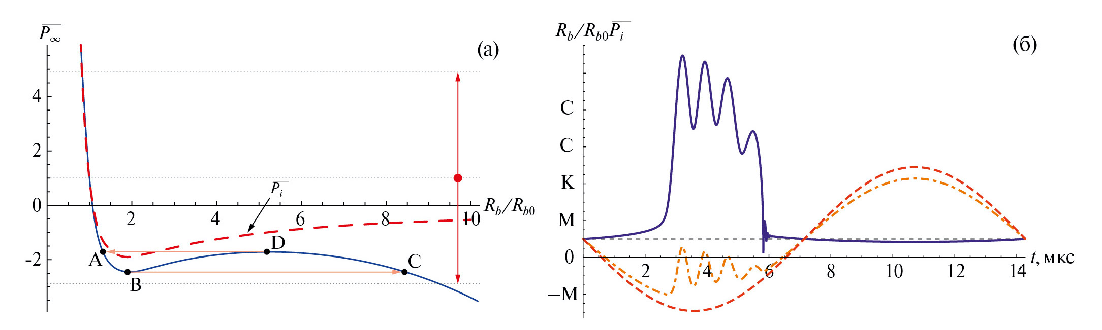 Точки A и B на рис. 2а соответствуют стабильному (ниже порога кавитации) и критическому (порог кавитации) состояниям пузырька соответственно. Критический пузырек будет расти до конечного размера, отмеченного точкой C, тогда как в модели бесконечной жидкости пузырек испытывает бесконечный рост (см. работу [31]).