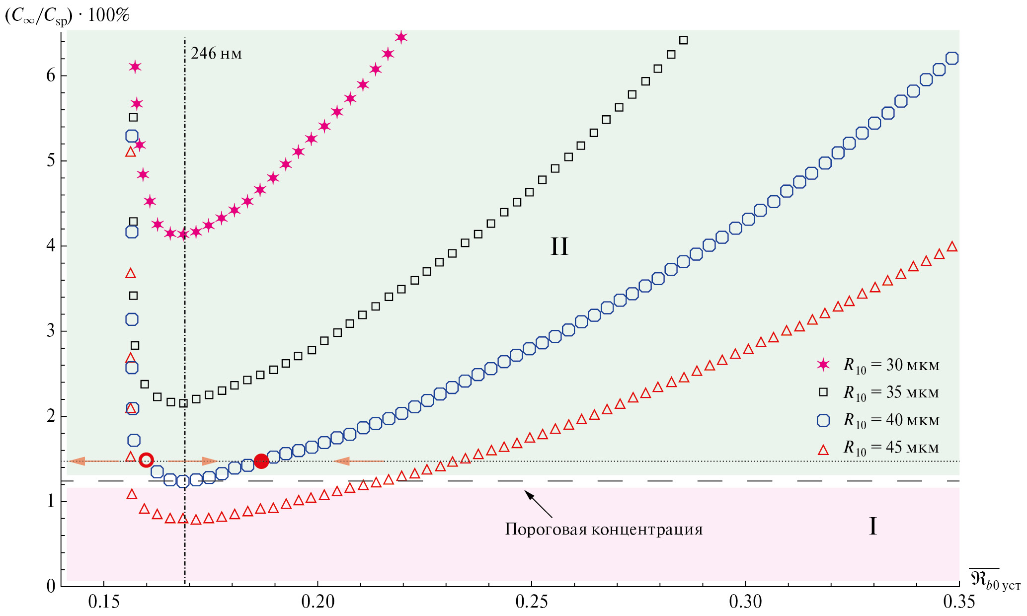 Концентрация газа 1.25% от csp является пороговой, обеспечивающей формирование устойчивого ненулевого размера пузырька (или на рис. 3). Это означает, что при фиксированной концентрации газа в жидкости пузырек любого ненулевого размера изменяется так, что результирующий устойчивый размер пузырька будет равен Для концентрации газа c∞ превышающей 1.25% от csp, существует устойчивое состояние пузырька, которое зависит от определенного значения концентрации газа в жидкости (область II на рис. 3).