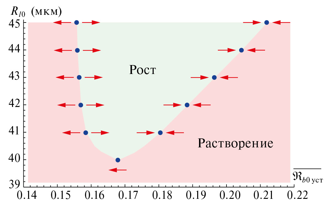 Рисунок 3 может быть представлен также в пространстве параметров — см. рис. 4. Для фиксированной концентрации газа 1.25% от csp можно рассмотреть равновесную диаграмму поведения пузырька для различных размеров ячейки жидкости. Небольшие значения приводят к полному растворению пузырьков любого размера, тогда как при критическом значении возникает устойчивый радиус пузырька (). Диаграмма на рис. 4 содержит области роста (светлое закрашивание) и растворения (темное закрашивание), где устойчивые и неустойчивые состояния пузырька обозначены сходящимися и расходящимися стрелками соответственно. При этом результирующий устойчивый размер пузырька монотонно растет с увеличением размера жидкой ячейки, что также сопровождается расширением области роста.