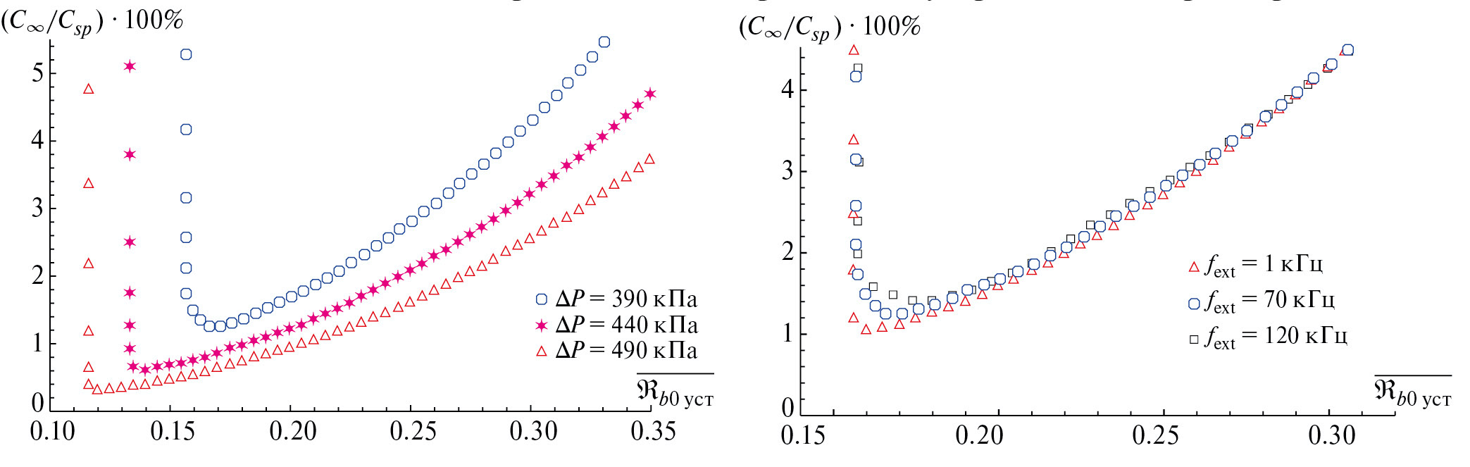 Анализ показывает, что по сравнению с изменением размера жидкой ячейки (см. рис. 3), уменьшение амплитуды давления приводит не только к увеличению пороговой концентрации газа, но и к образованию большего порогового радиуса пузырька. Это качественно согласуется с результатами работы [20], где авторы показали, что пороговая концентрация газа (как и соответствующий пороговый размер пузырька) увеличивается с уменьшением амплитуды давления внешней вынуждающей силы. На рис. 5б показан случай разных частот внешней вынуждающей силы в диапазоне для и При концентрации газа, превышающей 3% от csp, зависимость от частоты возбуждения отсутствует, и образующийся устойчивый пузырек формируется с одинаковым размером. Незначительное отличие возникает при небольшой концентрации газа, так что пороговая концентрация газа (как и пороговый радиус пузырька) имеет тенденцию к уменьшению с уменьшением частоты возбуждения.