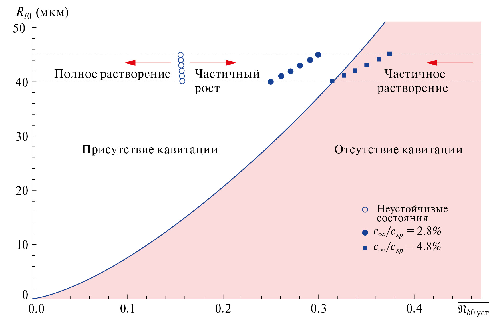 Анализ показывает, что режимы частичного растворения и частичного роста могут формироваться при условии трех динамических режимов пузырька: 1) при зарождении кавитации, где реализуются как ее возникновение, так и исчезновение; 2) при отсутствии кавитации, когда она полностью подавляется жидким микровключением и колебания пузырька проходят нелинейным (невзрывным) образом, и 3) при сочетании двух предыдущих динамических режимов, что соответствует переходной динамике пузырька с активацией/деактивацией зарождения кавитации. При этом концентрация растворенного газа в жидкости играет роль управляющего параметра, который позволяет регулировать режимом динамики при формировании устойчивого размера пузырька.