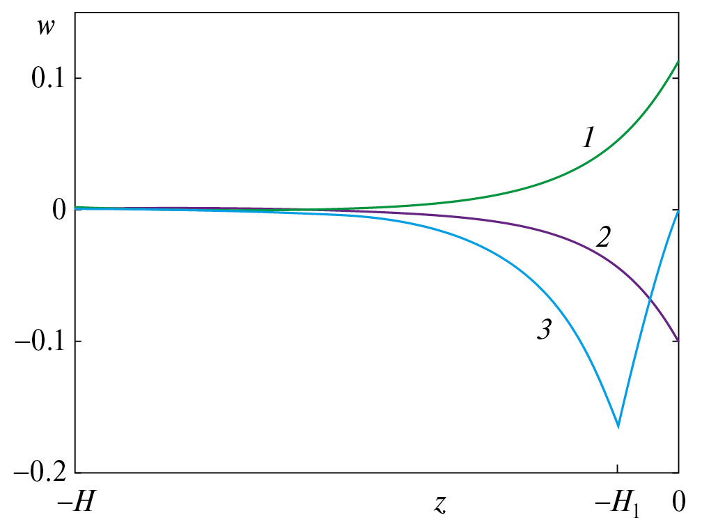 Собственные векторы, соответствующие изгибно-гравитационным волнам, имеют максимум на верхней поверхности, а собственный вектор дополнительной частоты имеет максимум на границе слоев. Пример таких векторов показан на рис. 1. Из рисунка видно, что векторы с номерами 1, 2 соответствуют изгибно-гравитационным волнам, а с номером 3 — волнам на границе слоев.