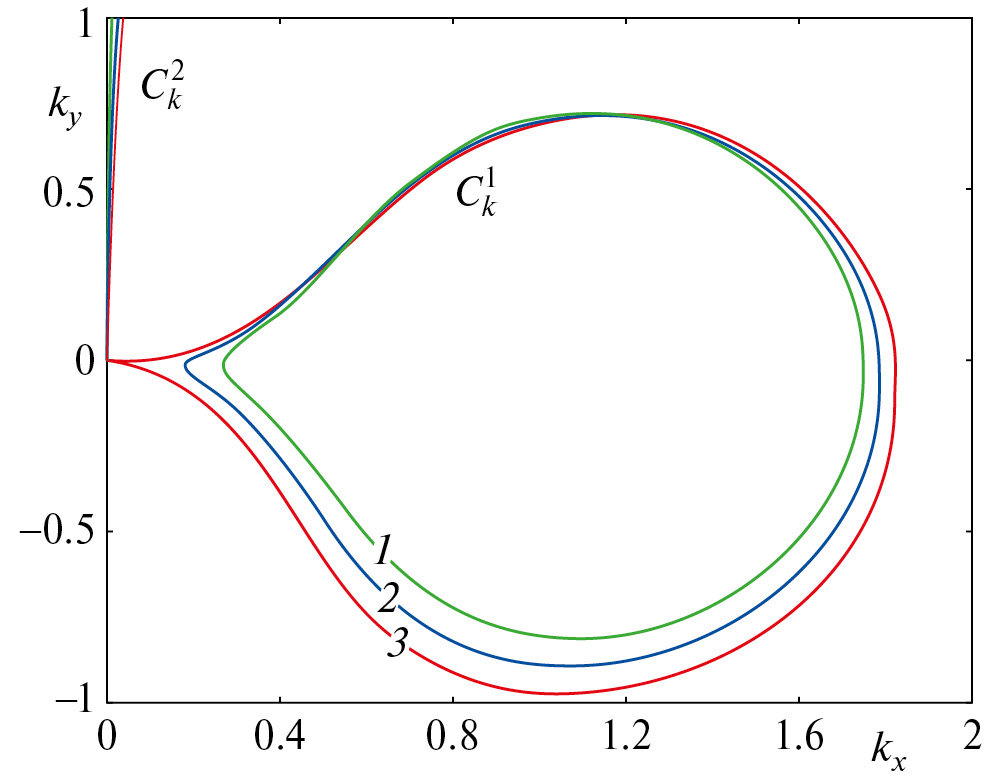 Рис. 2. Кривые волновых чисел для ледяного покрова толщиной 50 м, Q=0, 1–3 – S=0.4, 0.8, 1.2.