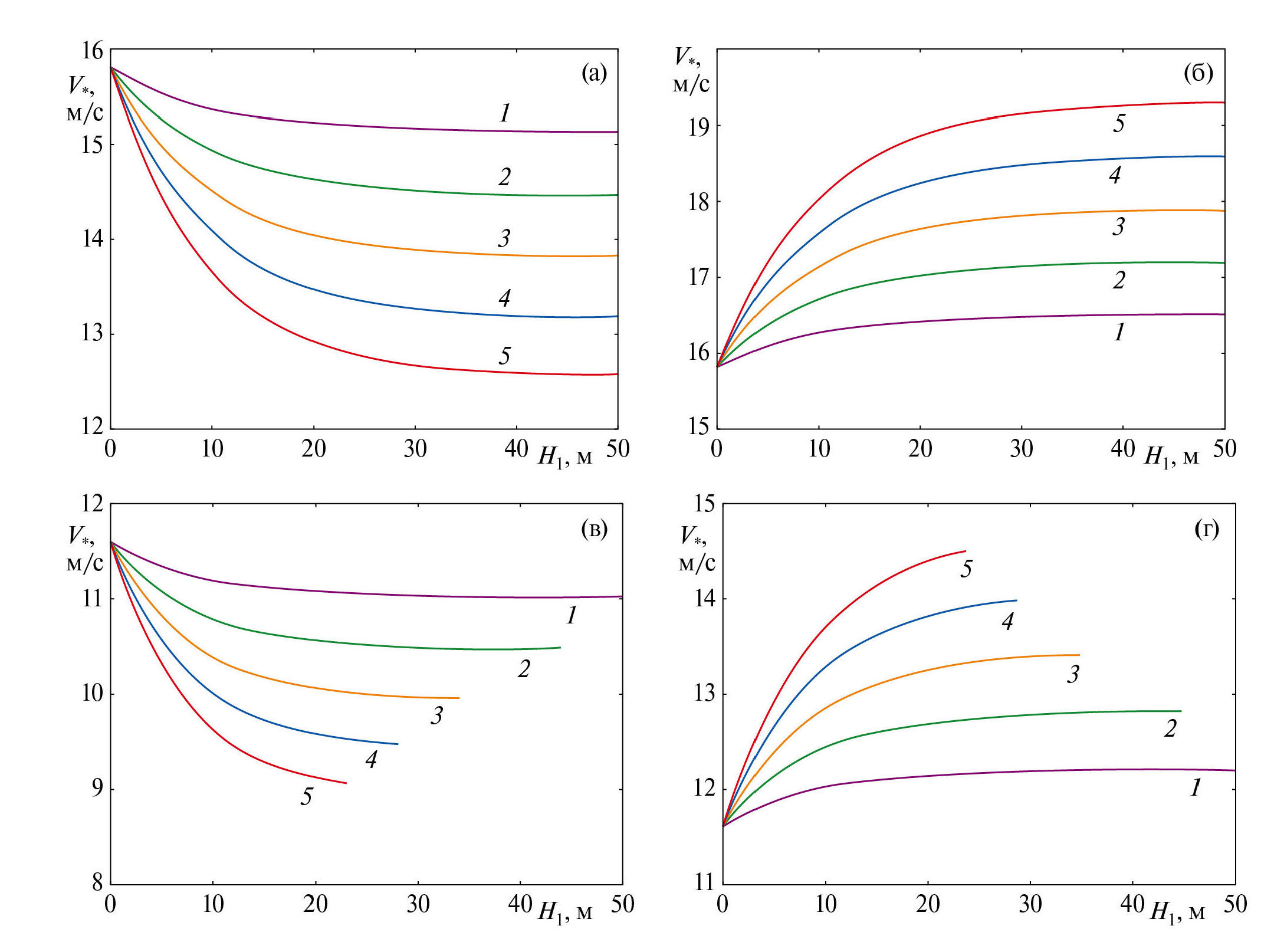 Рис. 3. Зависимость критических скоростей от толщины сдвигового слоя при (а, б) и (в, г), Ψ = 0 (а, в) и ψ = π (б, г): кривые 1–5 соответствуют значениям S=0.1, 0.2, 0.3, 0.4, 0.5.