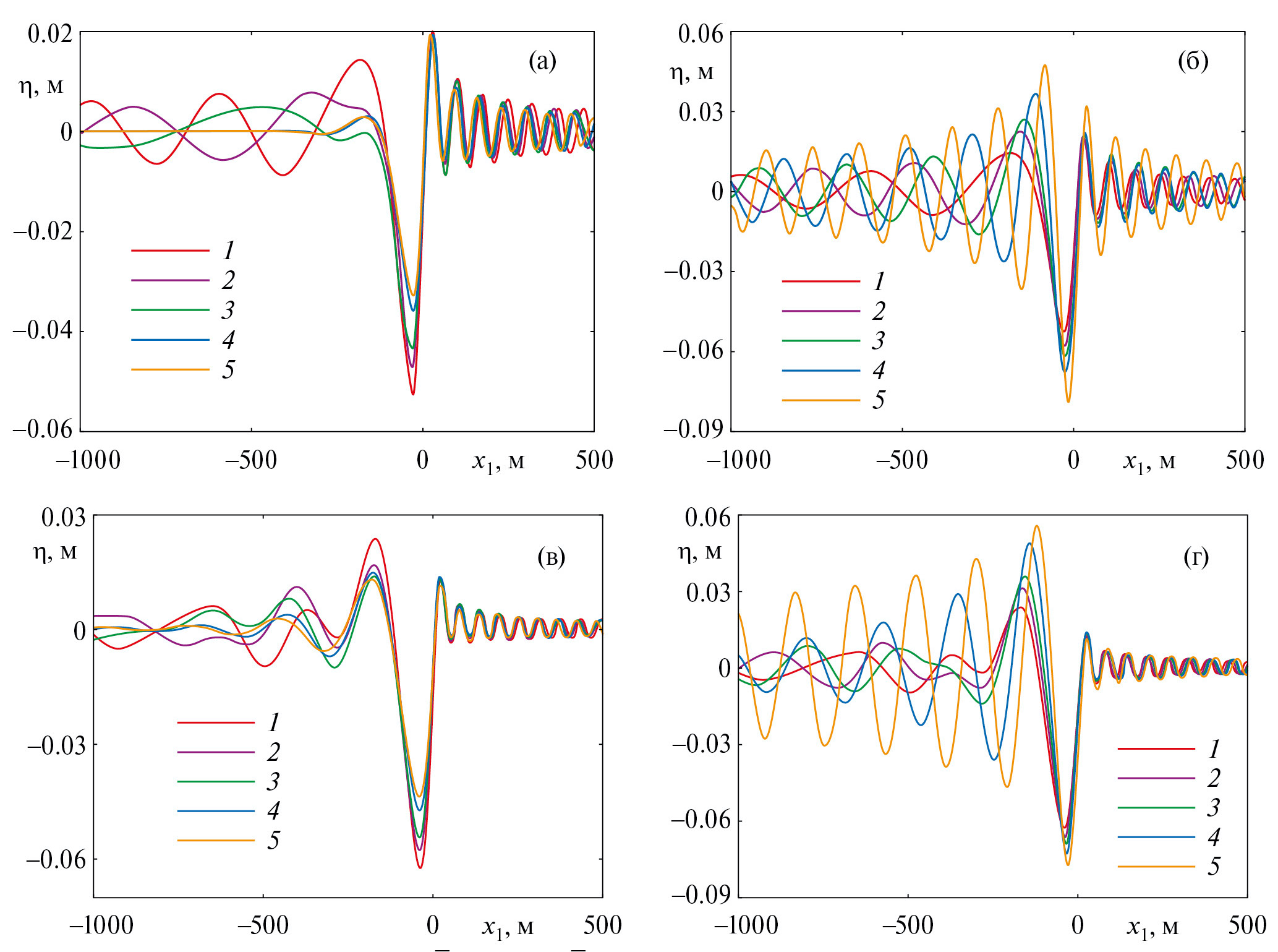 Рис. 4. Прогиб ледяного покрова при = 0 (а, б) и = 1 (в, г), ψ = 0 (а, в) и ψ = π (б, г): 1 – S = 0; 2, 3 – S = 0.3, 0.5 для двух слоев H1 = 5 м, H2 = 45 м; 4, 5 – S = 0.3, 0.5 для одного слоя H1 = H = 50 м.