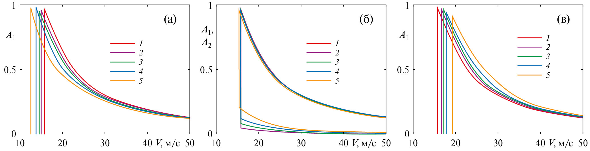 Рис. 5. Безразмерные коэффициенты волновых сил A1, A2 в зависимости от скорости движения нагрузки при = 0, ψ = 0 (а), ψ = π/2 (б) и ψ = π (в): 1 – S = 0; 2, 3 – S = 0.3, 0.5 для двух слоев: H1 = 5 м, H2 = 45 м; 4, 5 – S = 0.3, 0.5 для одного слоя: H = 50 м.