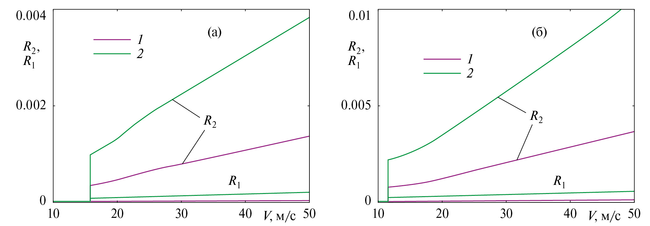 Рис. 7. Вклад дополнительных корней в волновые силы в зависимости от скорости движения нагрузки при H1 = 5 м, ψ = π/2, = 0 (а), = 1 (б): 1–2 – S = 0.3, 0.5.