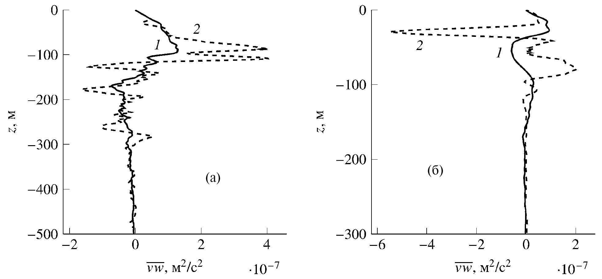 В более глубинных стратифицированных слоях коэффициент турбулентного обмена пропорционален Nc [19]. На рис. 7 представлены профили волнового uw (сплошная линия) и турбулентного (пунктирная линия) потоков импульса для первых двух мод при прямом численном решении краевой задачи (0.13)–(0.15). Турбулентный поток доминирует, особенно над потоком второй модой. Только в пикноклине у первой моды волновой поток сопоставим с турбулентным в интервале глубин 80–120 м.