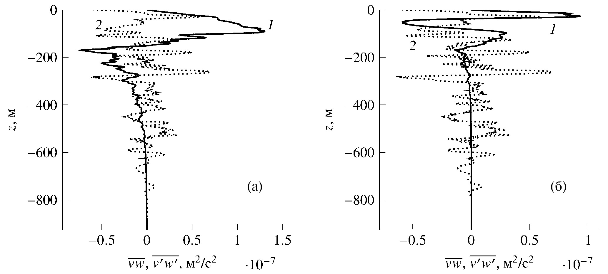 Турбулентный поток уступает волновому потоку vw у первой моды только в верхнем сильно стратифицированном 120-метровом слое. У второй моды в этом слое турбулентный и волновой потоки сопоставимы по величине. В более глубинных слоях турбулентный поток доминирует над волновым.