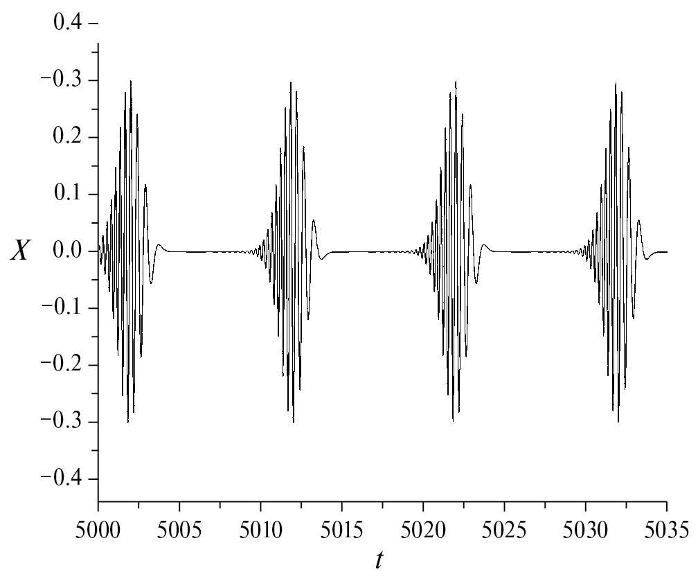 Полученные течения и обнаруженные переходы между тремя режимами (двумя синхронными и одним субгармоническим) являются новыми. В данной работе переходы к хаосу происходят либо через перемежаемость, либо через субгармонический каскад, а в работе [9] при среднечастотных колебаниях эти переходы происходили через квазипериодичность или перемежаемость.