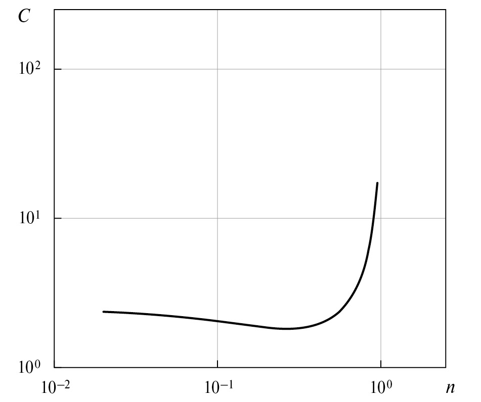 В качестве иллюстрации на рис. 1 представлена полученная зависимость значений константы интегрирования С от показателя степени n в реологической модели Оствальда – де Ваэля. Из рассмотрения этого графика следует, что функция C(n) на диапазоне 0.1 < n < 1 наиболее часто встречающихся на практике значений параметра n не является монотонной, достигая в некоторой точке n ≈ 0.271 экстремума типа минимум. При этом значению n = 1 соответствует вертикальная асимптота.