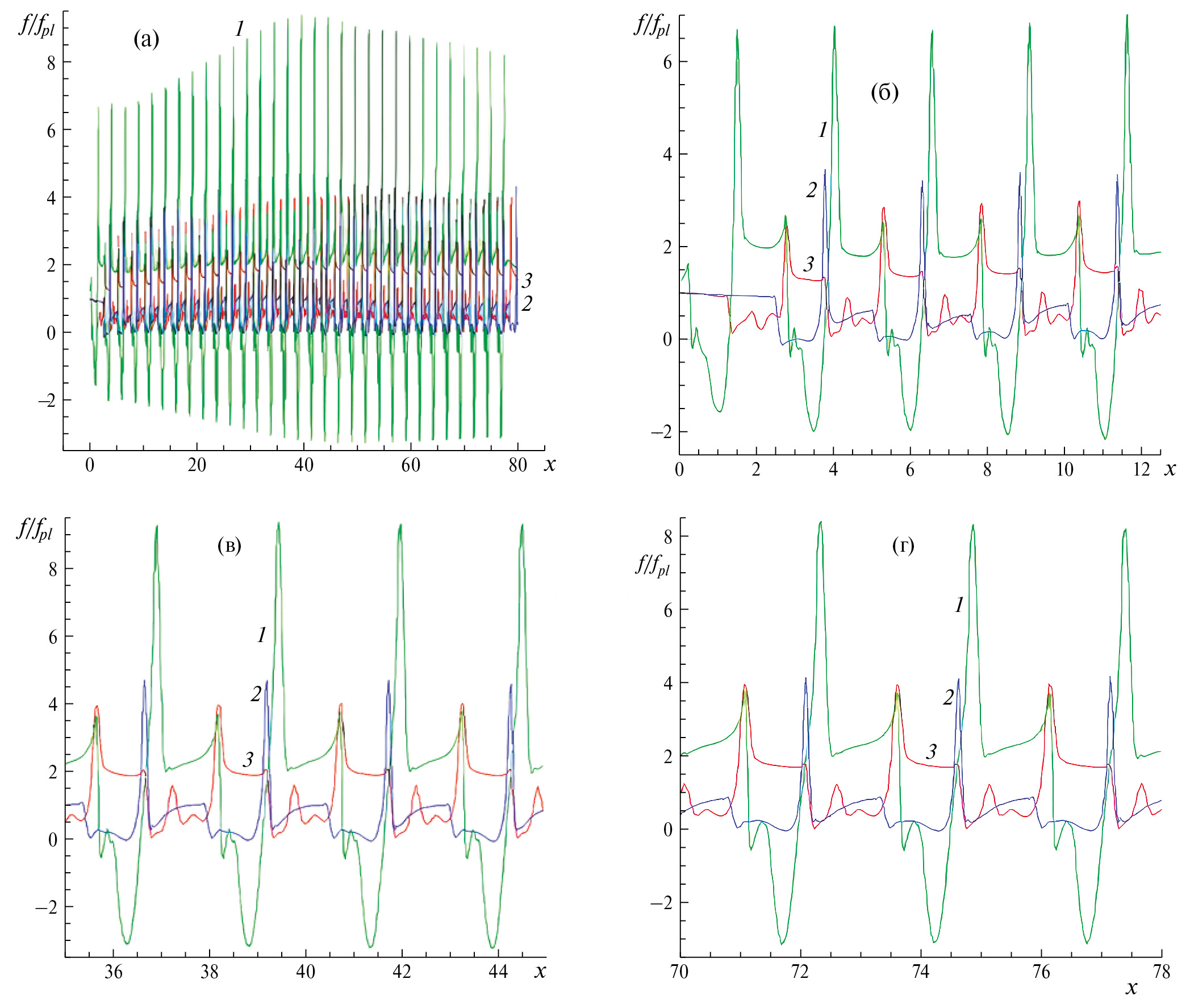 На последнем участке канала наблюдается тенденция к стабилизации характеристик при некотором снижении разброса амплитуд колебаний. Для детального анализа фаз развития, достижения наибольших экстремумов и приближения к стабилизации течения в канале представляются укрупненные фрагменты f/fpl(x) в районе первой, двадцатой и тридцатой канавок (рис. 2б–г). С этой целью на этих и последующих рисунках рассматриваются входной (протяженностью от 0 до 12.5), средний (от 35 до 45 для относительного трения и перепада давления и от 46 до 56 для относительной осредненной теплоотдачи) и выходной участок (от 70 до 78).