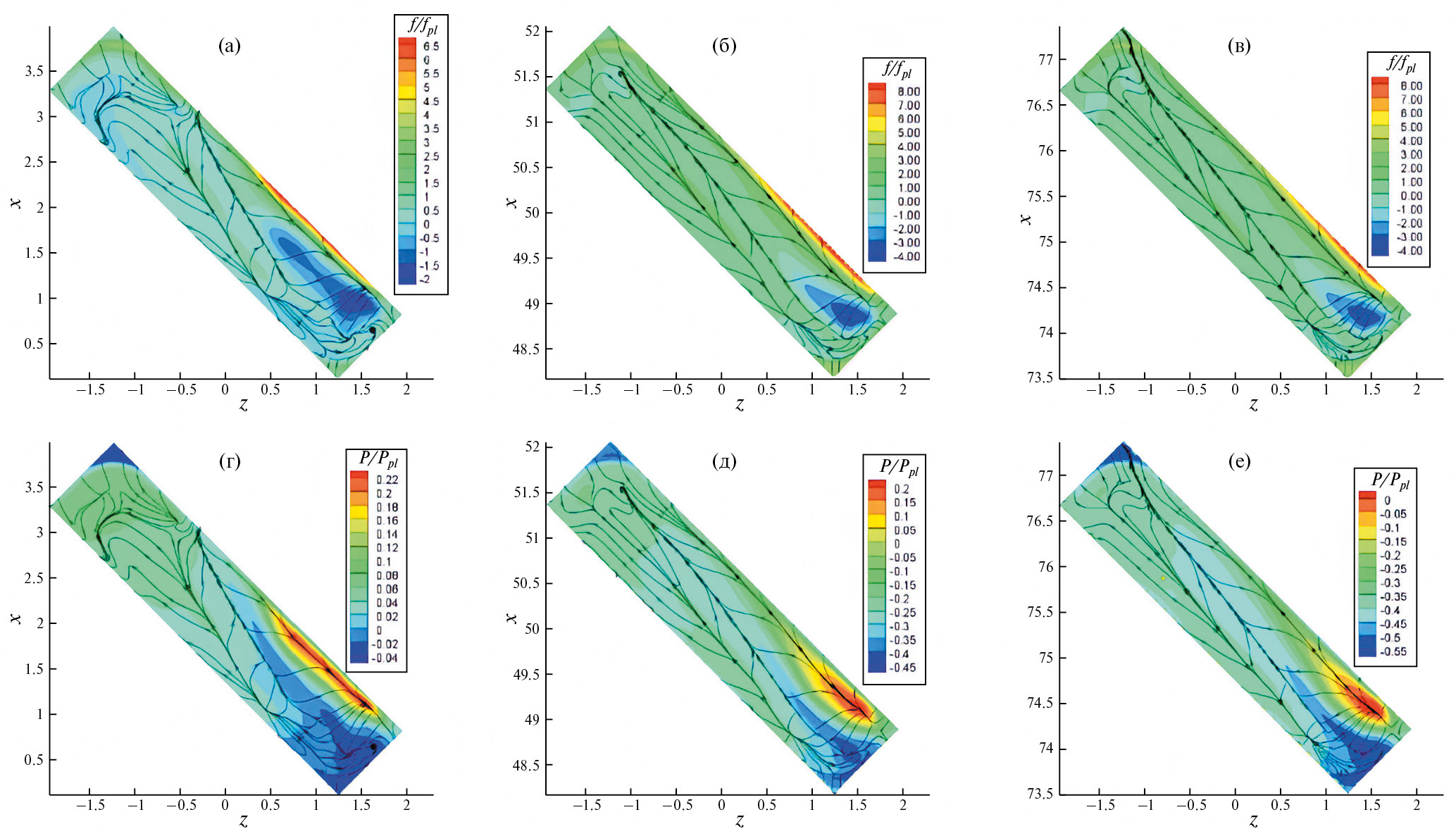 Рис. 8. Сравнение поверхностных распределений относительного трения f/fpl (а–в) и перепадов относительного статического давления P–Ppl (г–е) для первой (а, г), 20-й (б, д) и 30-й (в, е) канавок.