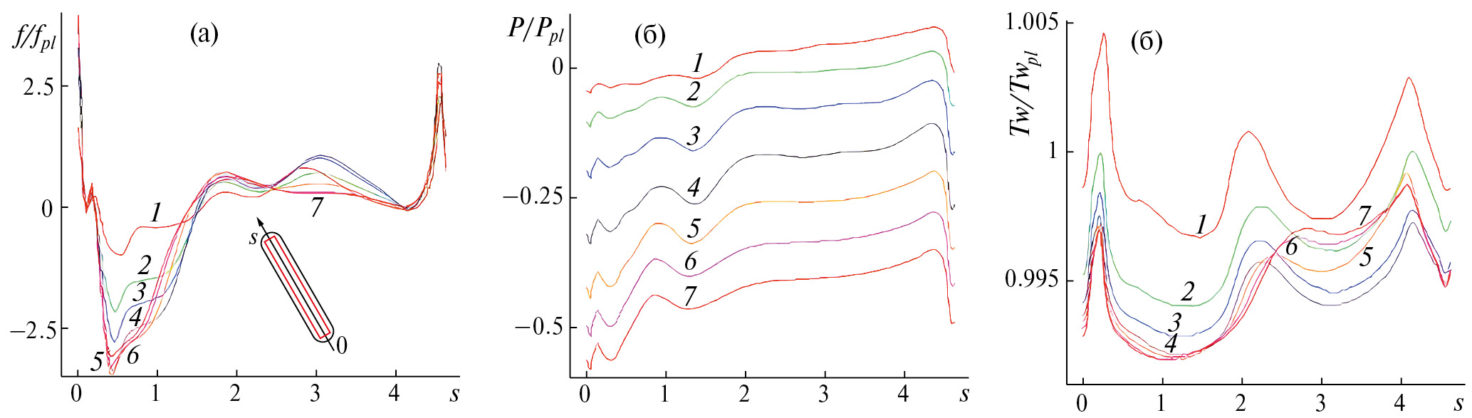 Показанные на рис. 2а распределения относительного трения f/fpl(x) демонстрируют волнообразный характер изменения трения с быстрым нарастанием амплитуды колебаний по мере отхода от входного сечения канала. Примерно к 20-й канавке величины f/fpl принимают экстремальные значения.