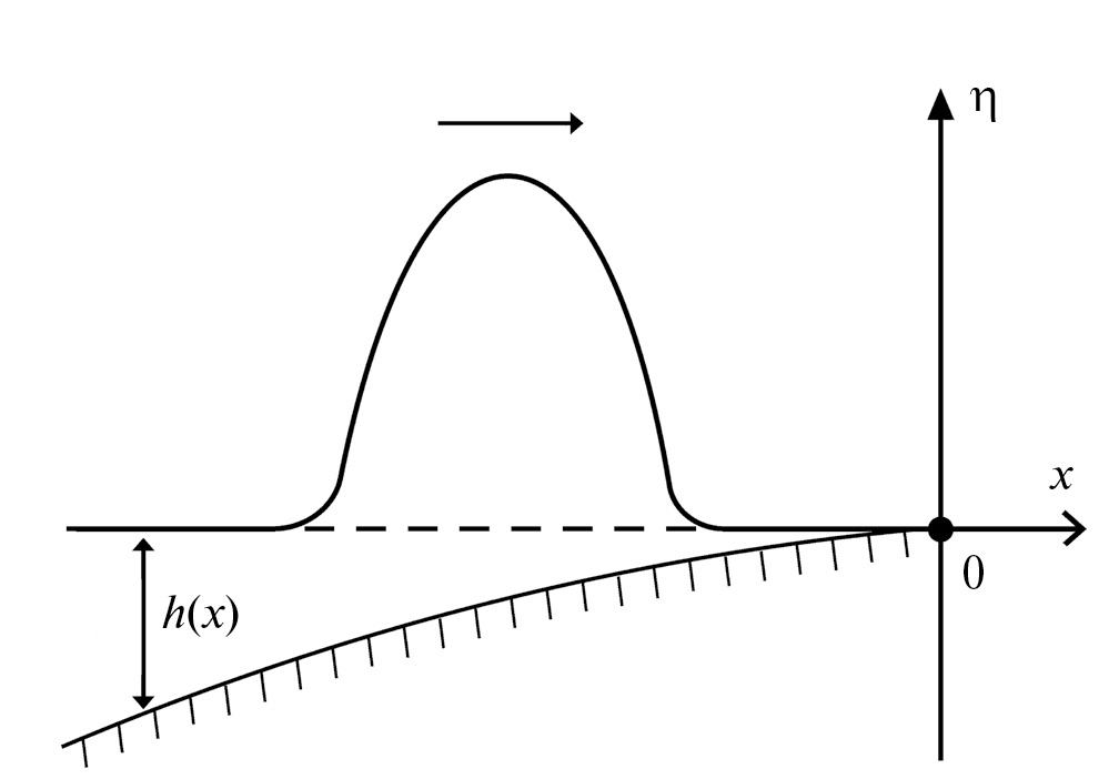 В дальнейшем мы будем рассматривать только функции смещения и скорости из пространства L2, описывающие волны с конечной энергией (уединенные волны). Смещение волны, приближающейся к берегу, записывается как