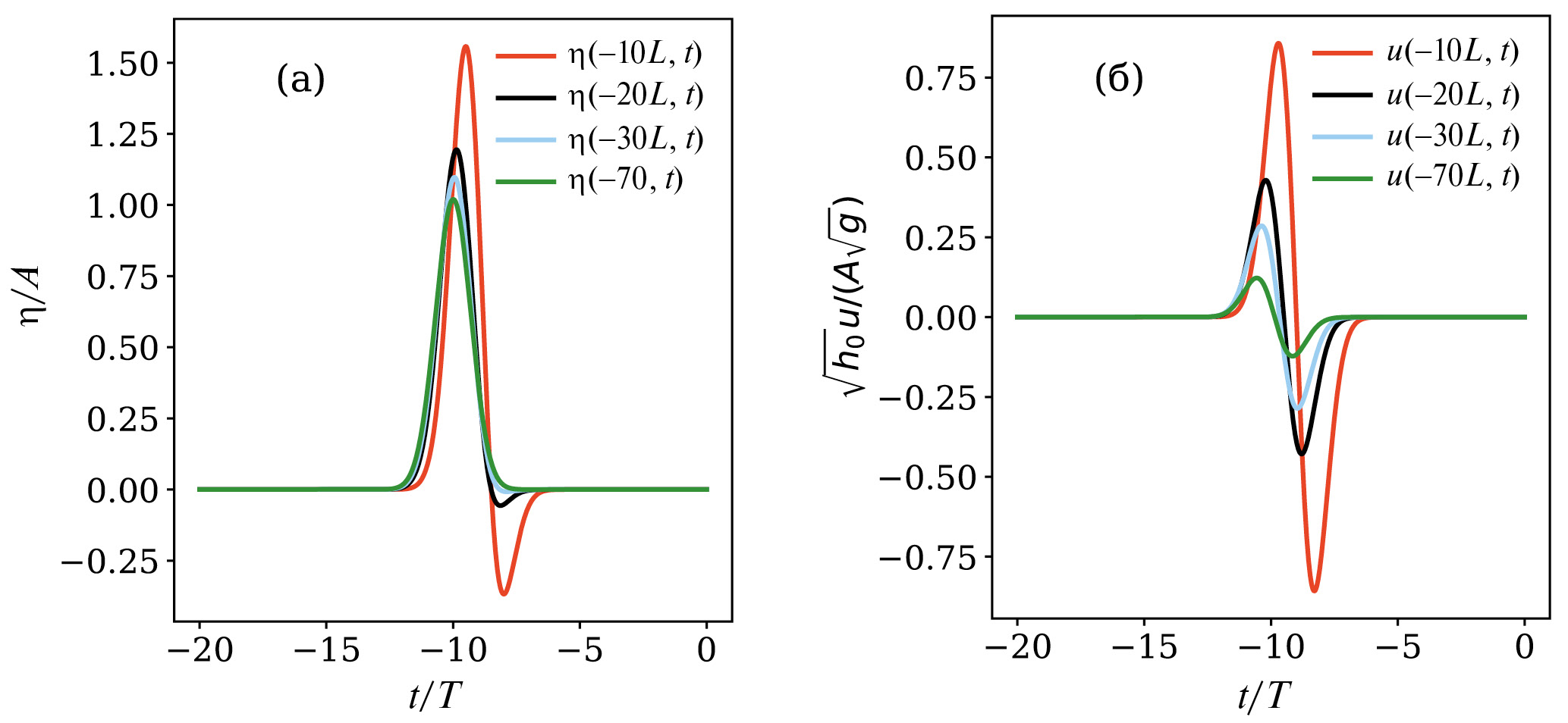 Рис. 5. Мареограммы смещения (а) и скорости (б) вдали от берега, и постепенная трансформация формы волны.
