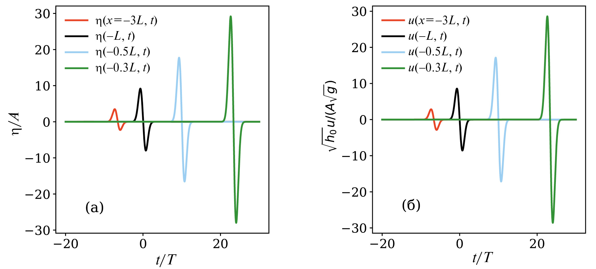 Вдали от берега (см. рис. 2) импульс – чисто гауссовский. Графики практически не сдвигаются на рисунке – так и должно быть: у волны очень большая скорость движения, поэтому из точки x = -70L она практически сразу же приходит в x = -10L. Затем форма волны не интегрируется, как в случае с натуральным m, а дифференцируется, что можно заметить на рис. 3 (слева). Амплитуда ее растет по закону Грина, и при этом волна все сильнее и сильнее замедляется. Далее происходит обрушение, чего линейная теория не учитывает (см. рис. 4). Рисунки 2–4 (справа), как и предполагала формула, иллюстрируют рост амплитуды и неизменность формы графика скорости.
