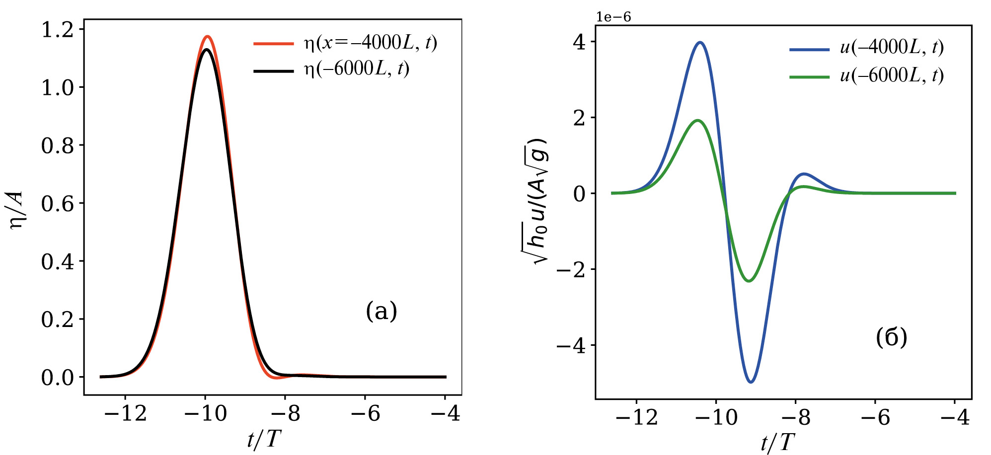 Рис. 7. Мареограммы смещения (а) и скорости (б) при подходе к берегу.
