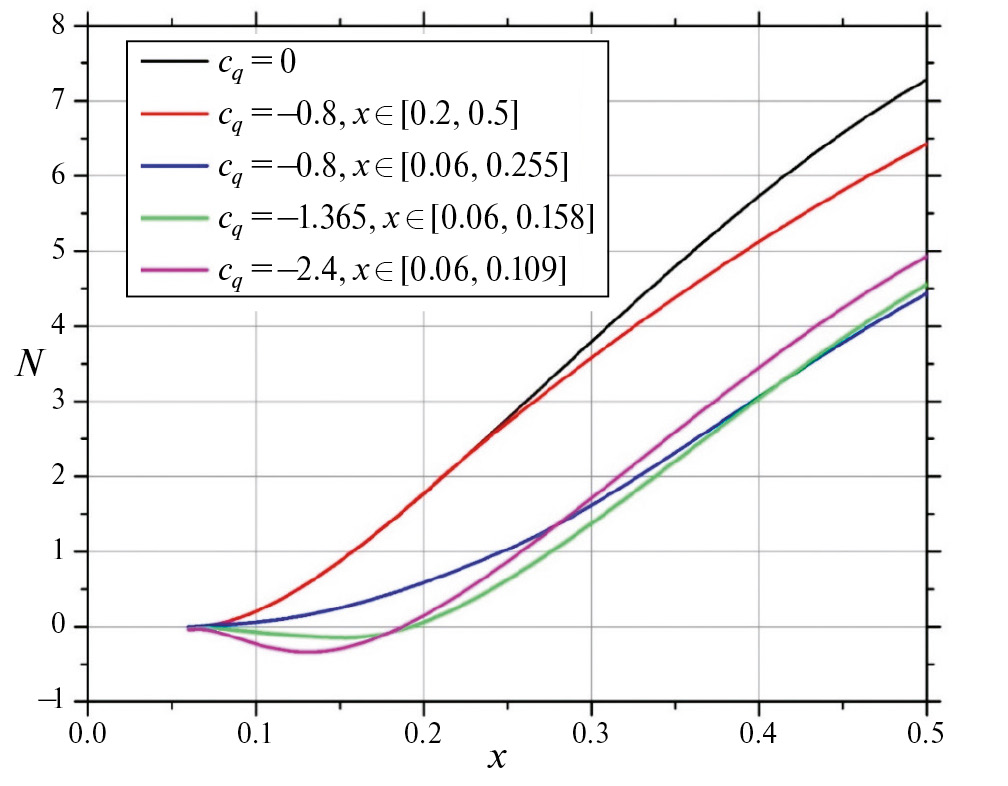 На рис. 8 представлены данные по эффективности отсоса: разница расчетного числа N-фактора в сечении x = 0.5 для рассматриваемого случая с отсосом (N suct) и без него (N 0): . Расчет проводится для всех случаев с положением начала области отсоса в точке xs = 0.06.