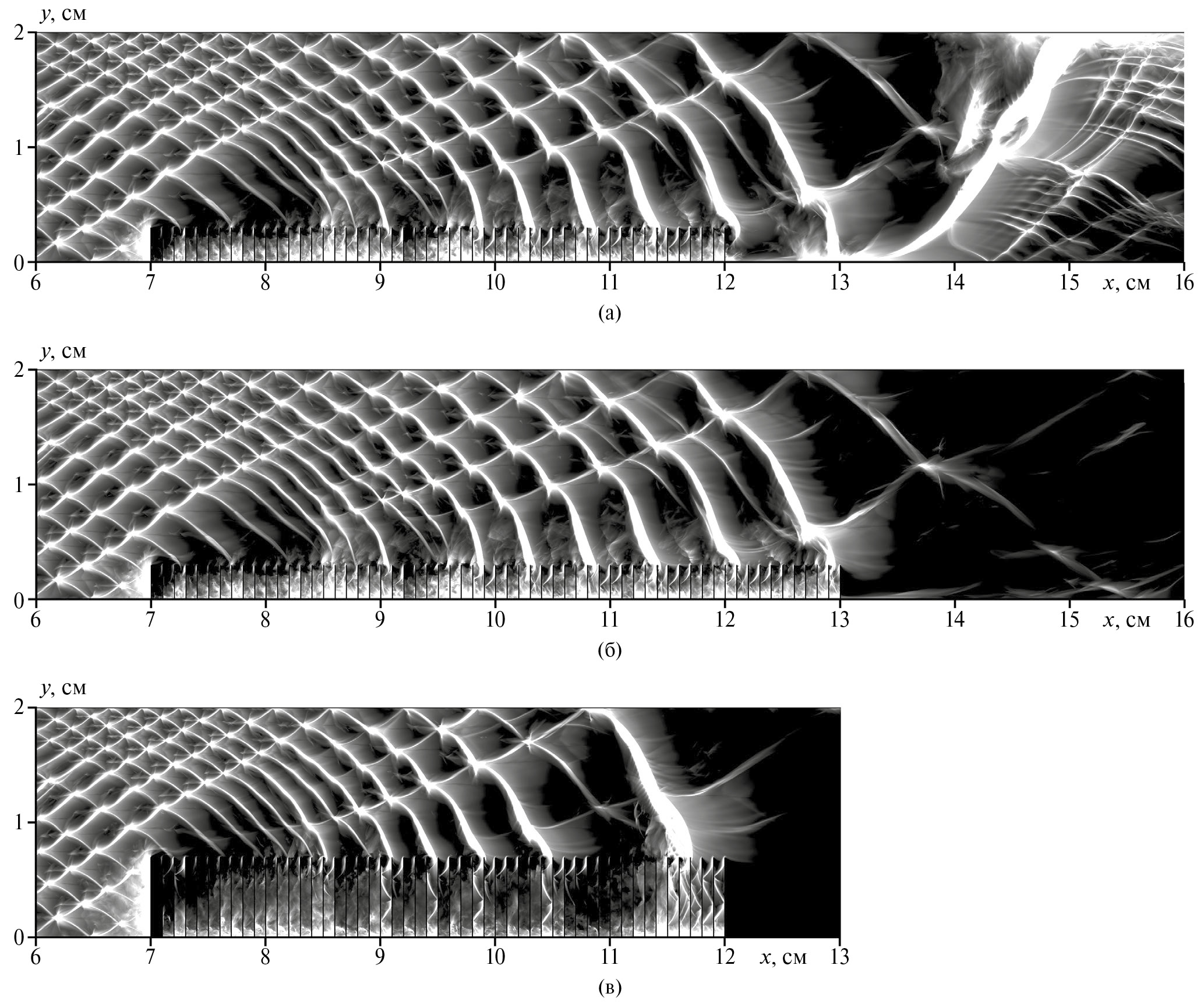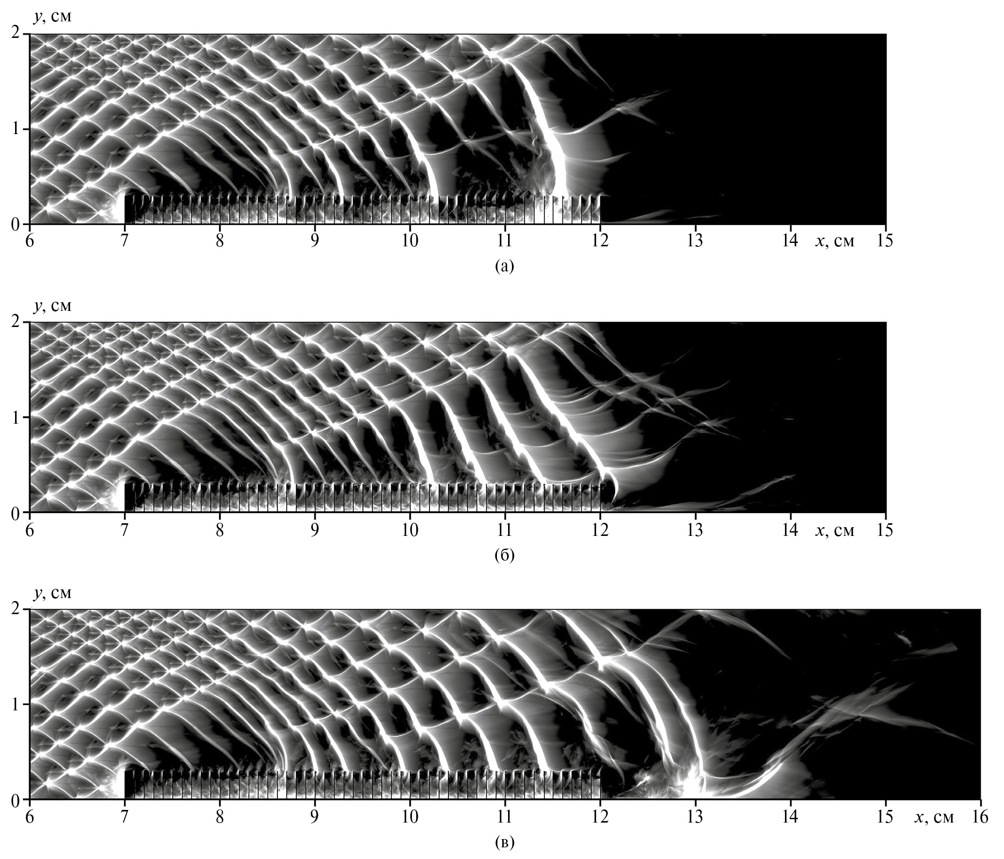 Рис. 1. Численные аналоги следа детонационной волны при взаимодействии с множественными барьерами (DLb = 1 мм): а – реинициирование детонации при Lb = 5 см и Hb = 3 мм; б, в – гашение детонационного горения при Lb = 6 см, Hb = 3 мм и Lb = 5 см, Hb = 7 мм соответственно. Здесь и далее волна распространяется слева направо.