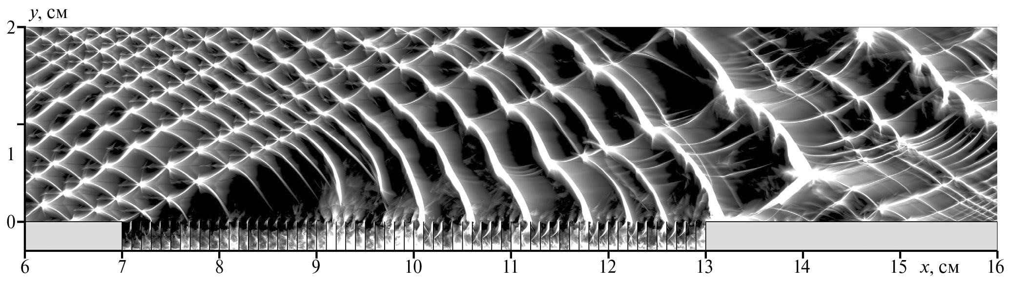 Рис. 2. Численный аналог следа детонационной волны при взаимодействии с множественными барьерами, расположенными в углублении в стенке канала (Lb = 6 см, Hb = 3 мм, DLb = 1 мм).