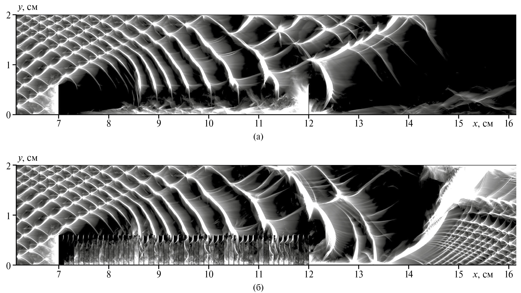 Рис. 4. Численный след детонационной волны при взаимодействии со слоем воздуха и областью с барьерами (DLb = 1 мм) при Lb = 5 см и Hb = 6 мм: а – гашение детонационного горения слоем воздуха; б – реинициирование детонации после прохождения области с барьерами.