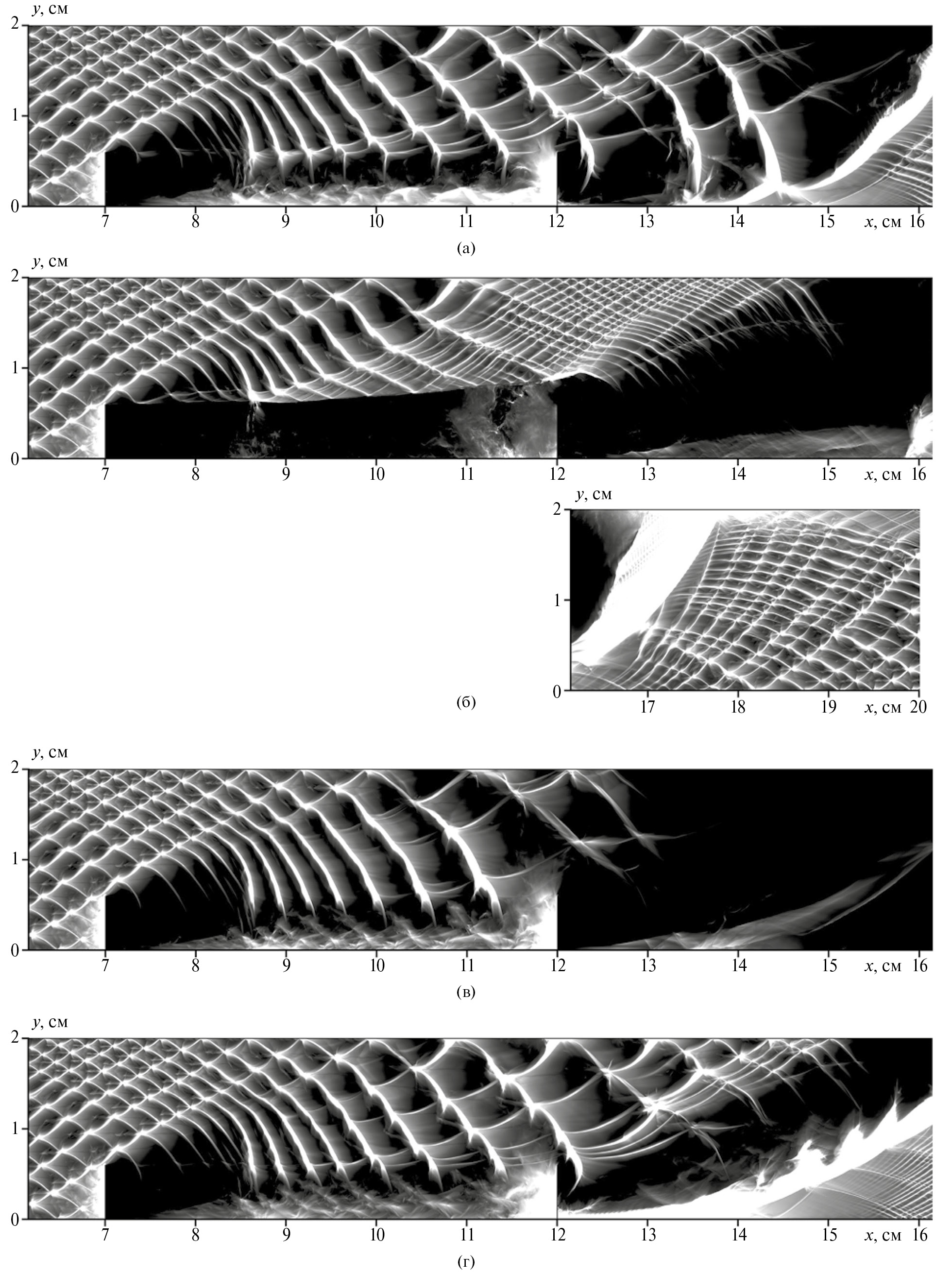 Однако расширение области до Lb = 6 см или увеличение высоты препятствий до Hb = 7 мм оказываются достаточными условиями для гашения детонационного горения барьерами (рис. 1б, в). На рис. 1 и далее представлены численные аналоги следа, оставляемого в эксперименте проходящей детонационной волной на расположенной вдоль стенки канала закопченной пластине.