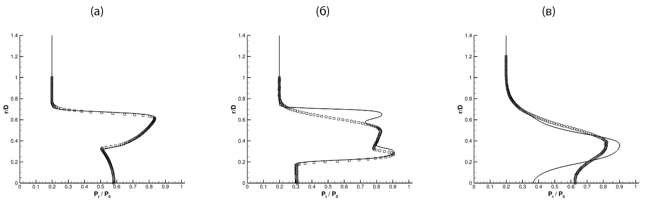 Расчетные и экспериментальные профили давления Пито хорошо совпадают в сечениях, близких к срезу сопла. Ниже по течению согласие ухудшается. Неявный МКВ позволяет описать наблюдаемый в эксперименте рост давления Пито на оси струи, что не удается сделать с помощью моделей турбулентности, основанных на гипотезе Буссинеска.