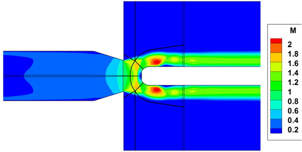 Рис. 1. Расчетная область при численном моделировании течения в плазмотроне ВГУ-4 при обтекании модели с плоским датчиком. Показано распределение локального числа маха M.